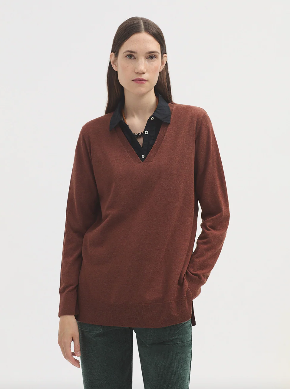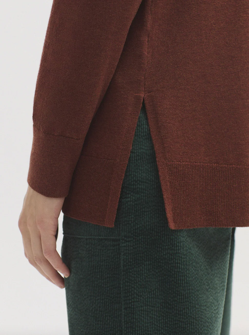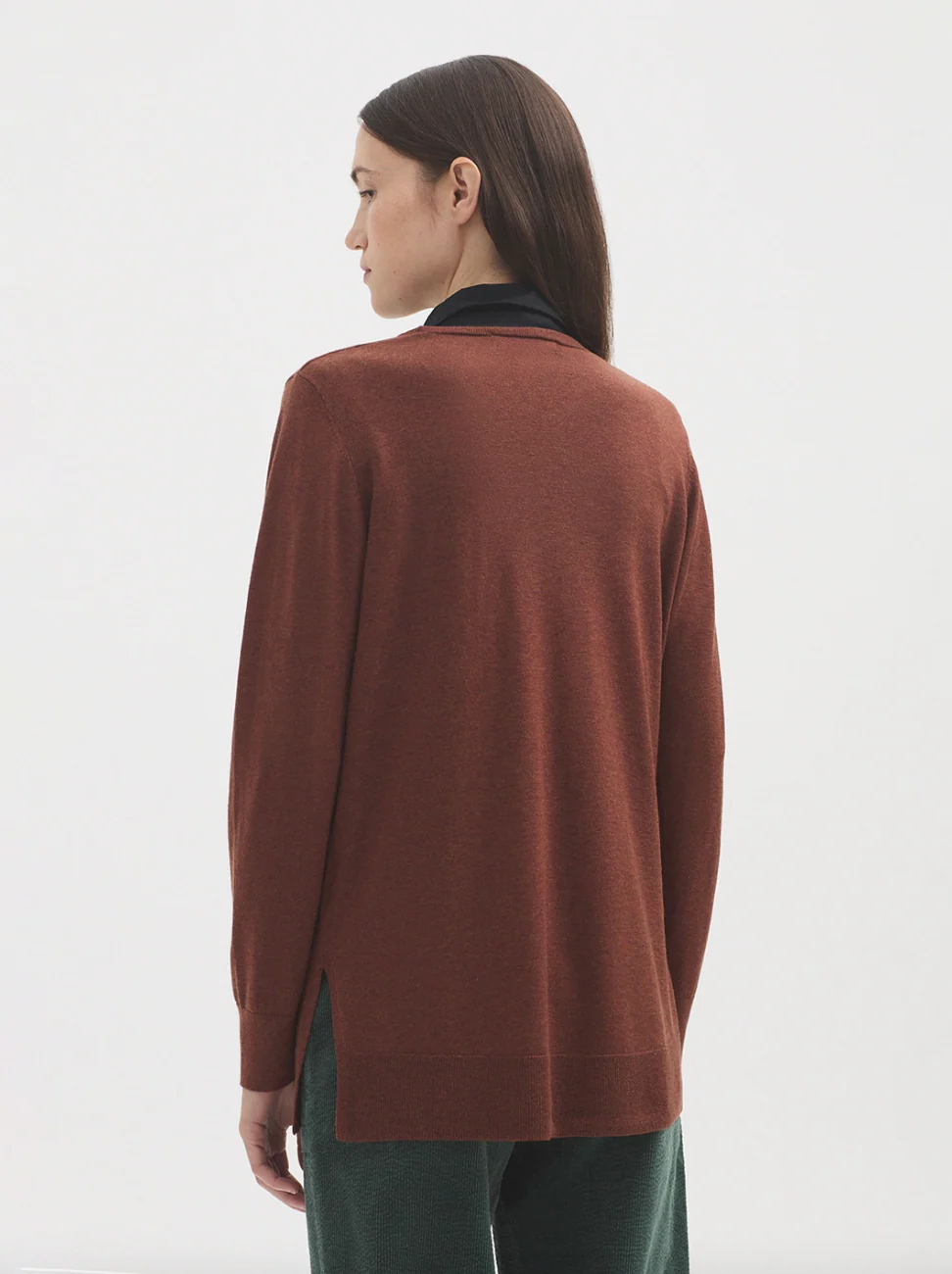Jersey básico largo en mezcla de lana merino y cashmere. Escote pico. Manga larga y aberturas laterales. Acabados en canalé.