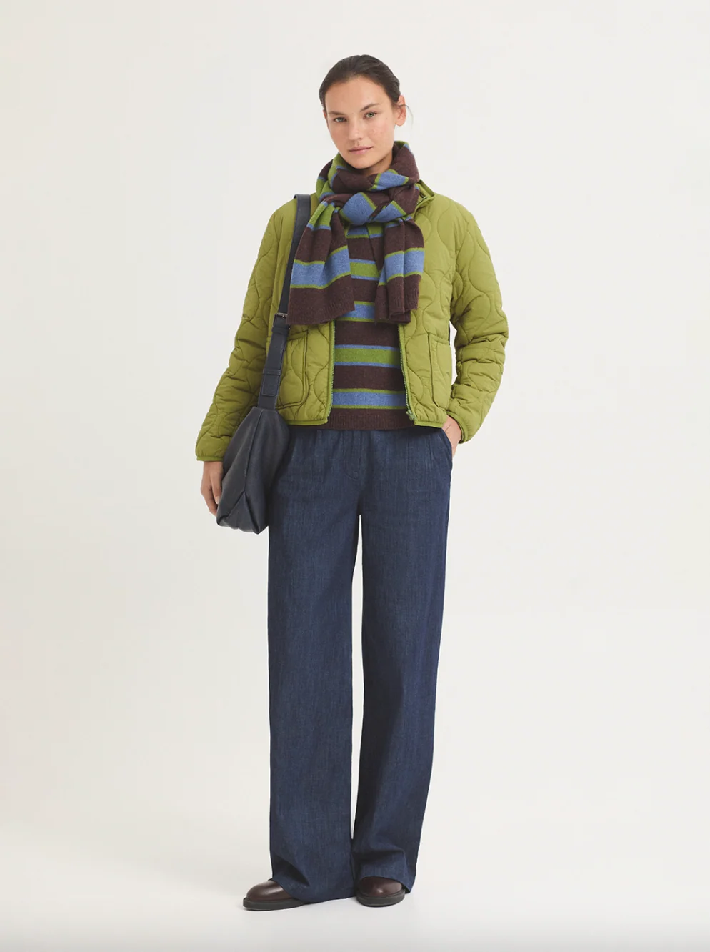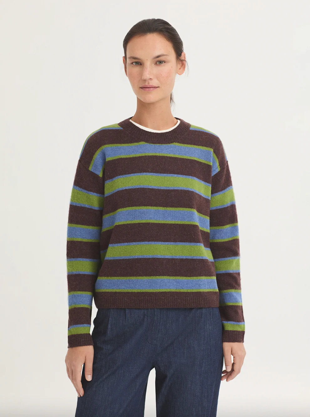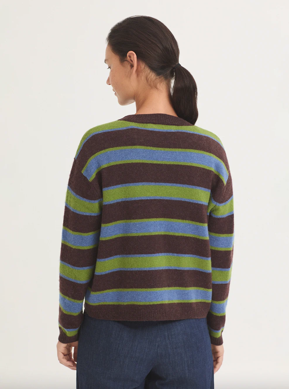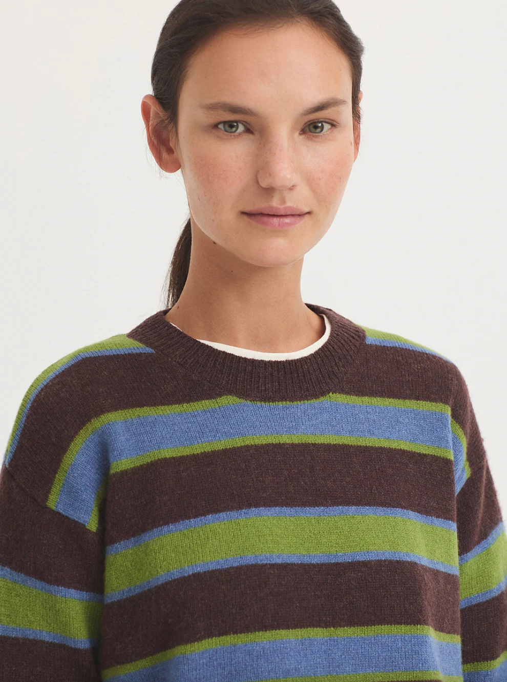 Jersey básico de rayas tricolor en lana. Cuello redondo, manga larga y acabados en rib.