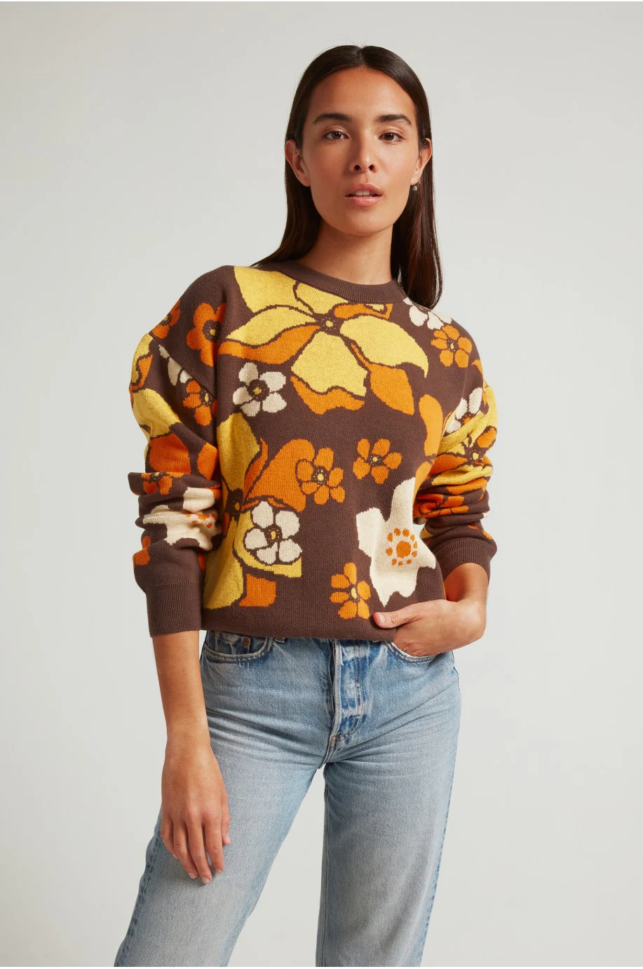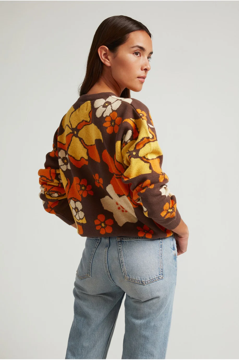 Jersey marrón con flores vintage en tonos naranja y amarillo, de hombro caído, holgado, con cuello y puños acanalados a tono.