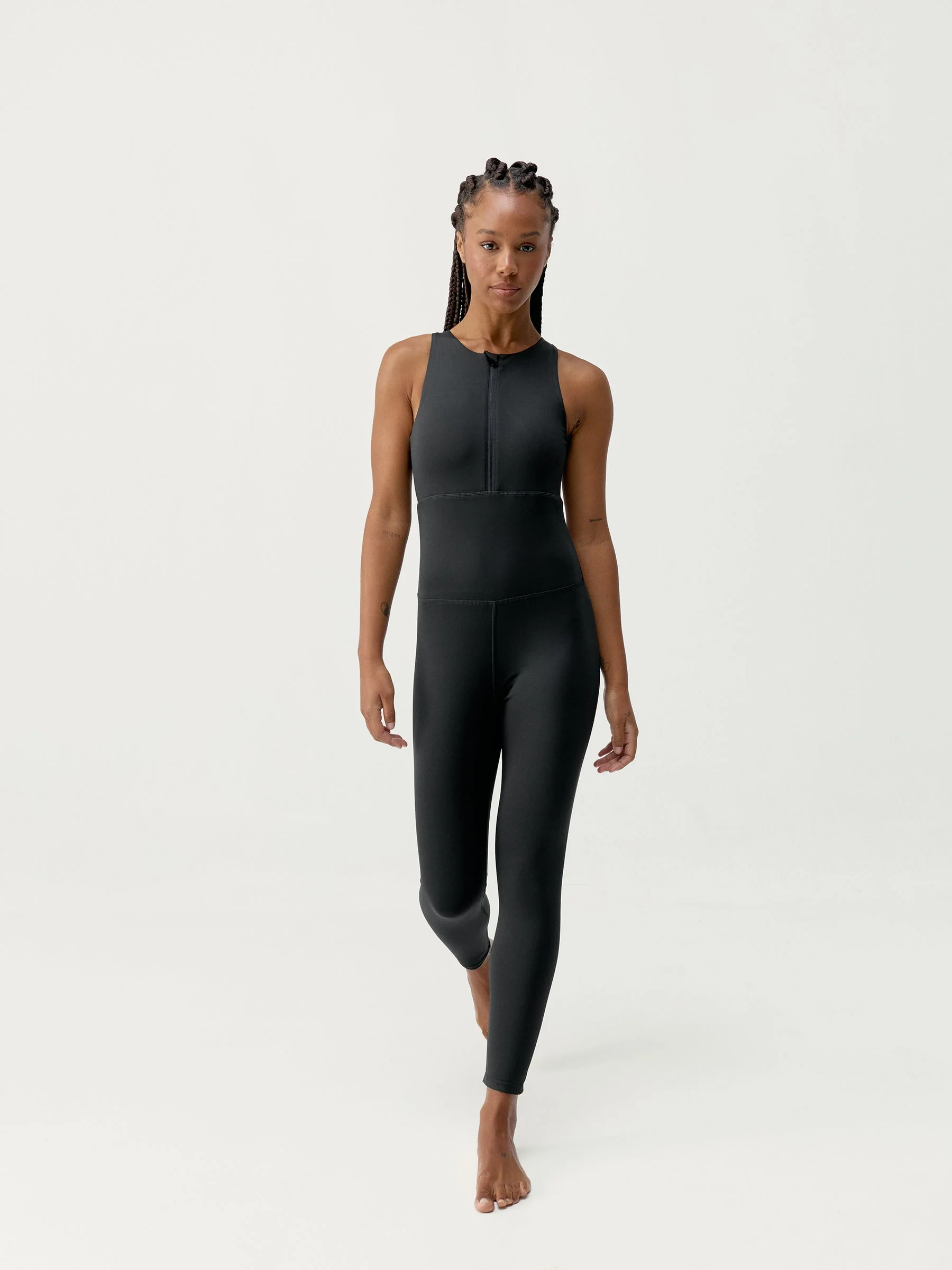 Mono largo de sujeción media alta con doble tejido en la cintura que comprime y estiliza la silueta. Escote con cremallera y abertura posterior para una mayor transpirabilidad. Tejido Shapplex_B, compacto y ligero. Incluye copas extraíbles.