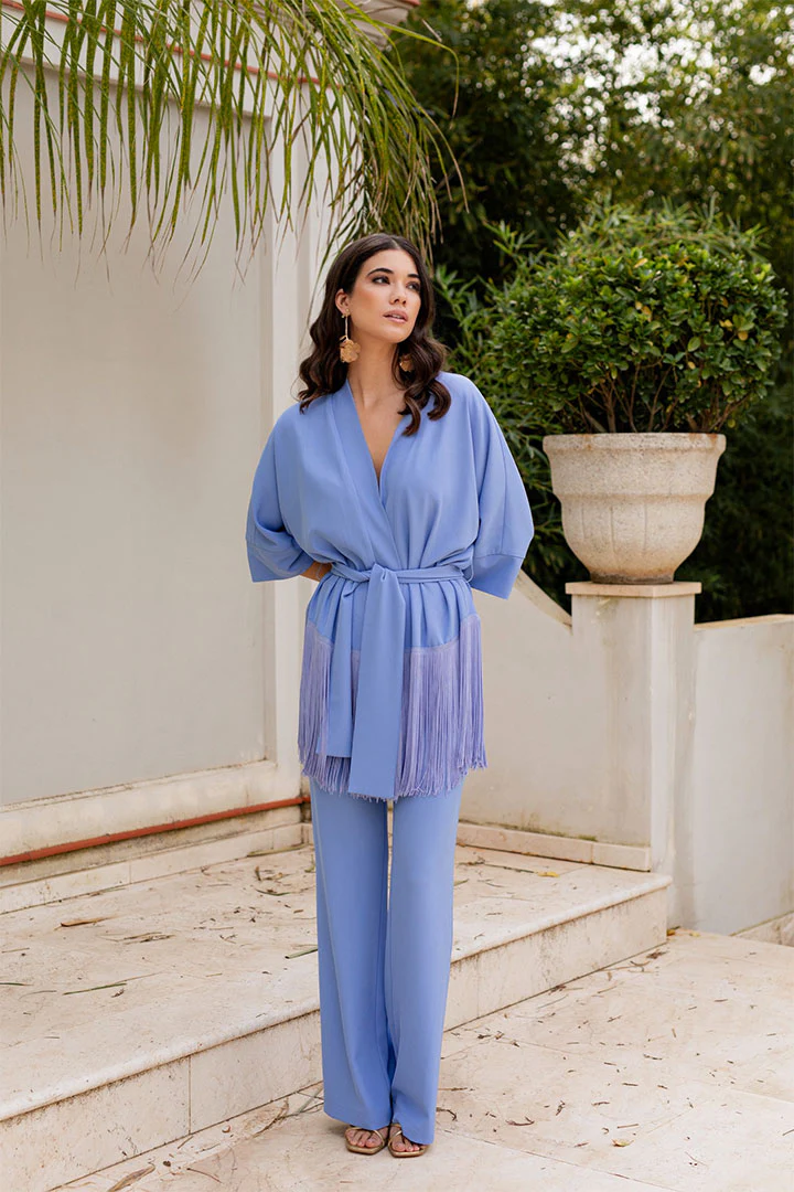 Kimono de color celeste origen japonés, de mangas anchas y largas, abierta por delante y que se ciñe, cruzándola, mediante un cinturón.