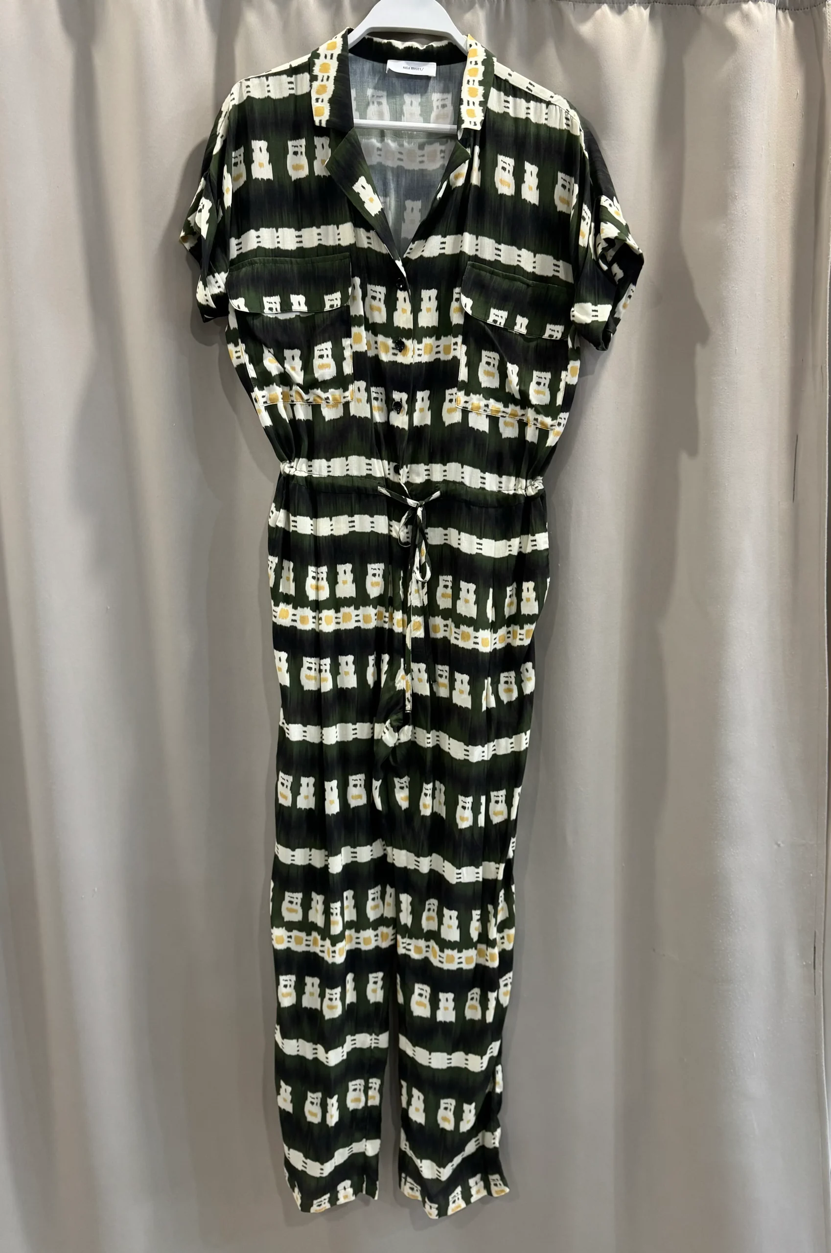 Mono de manga corta con lazo que ajusta la cinturilla, con cierre de botones en la parte frontal, estampado de tonos verdosos.
