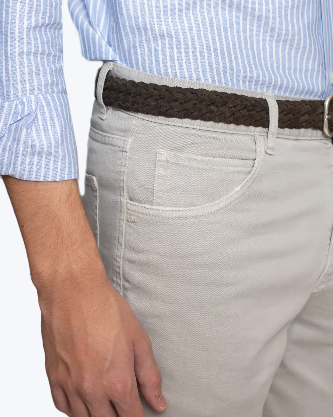 Pantalón topo de la marca 40Weft con corte regular slim fit. La pernera se va estrechando ligeramente hasta el tobillo para estilizar la pierna, pero sin quedar ajustado.