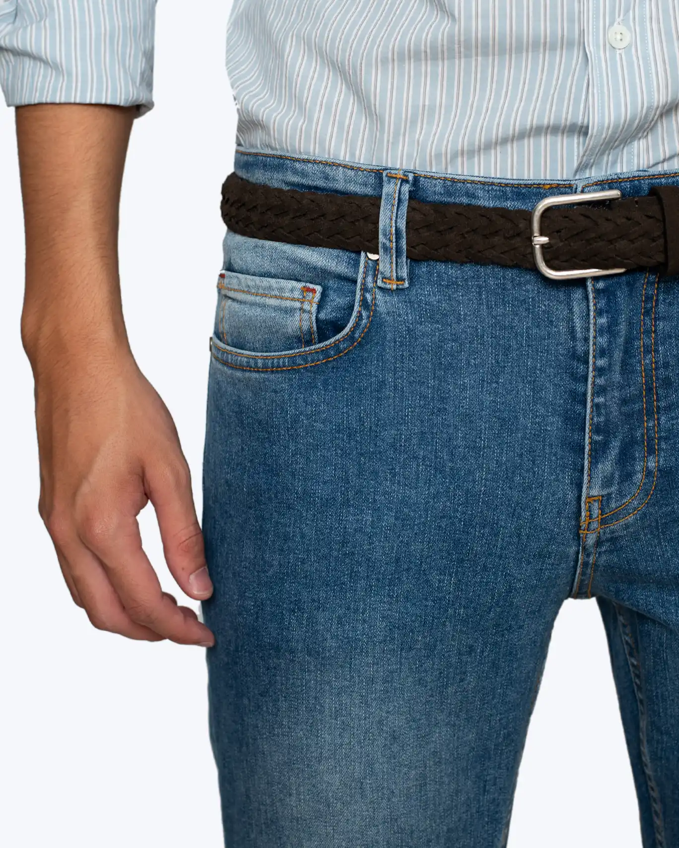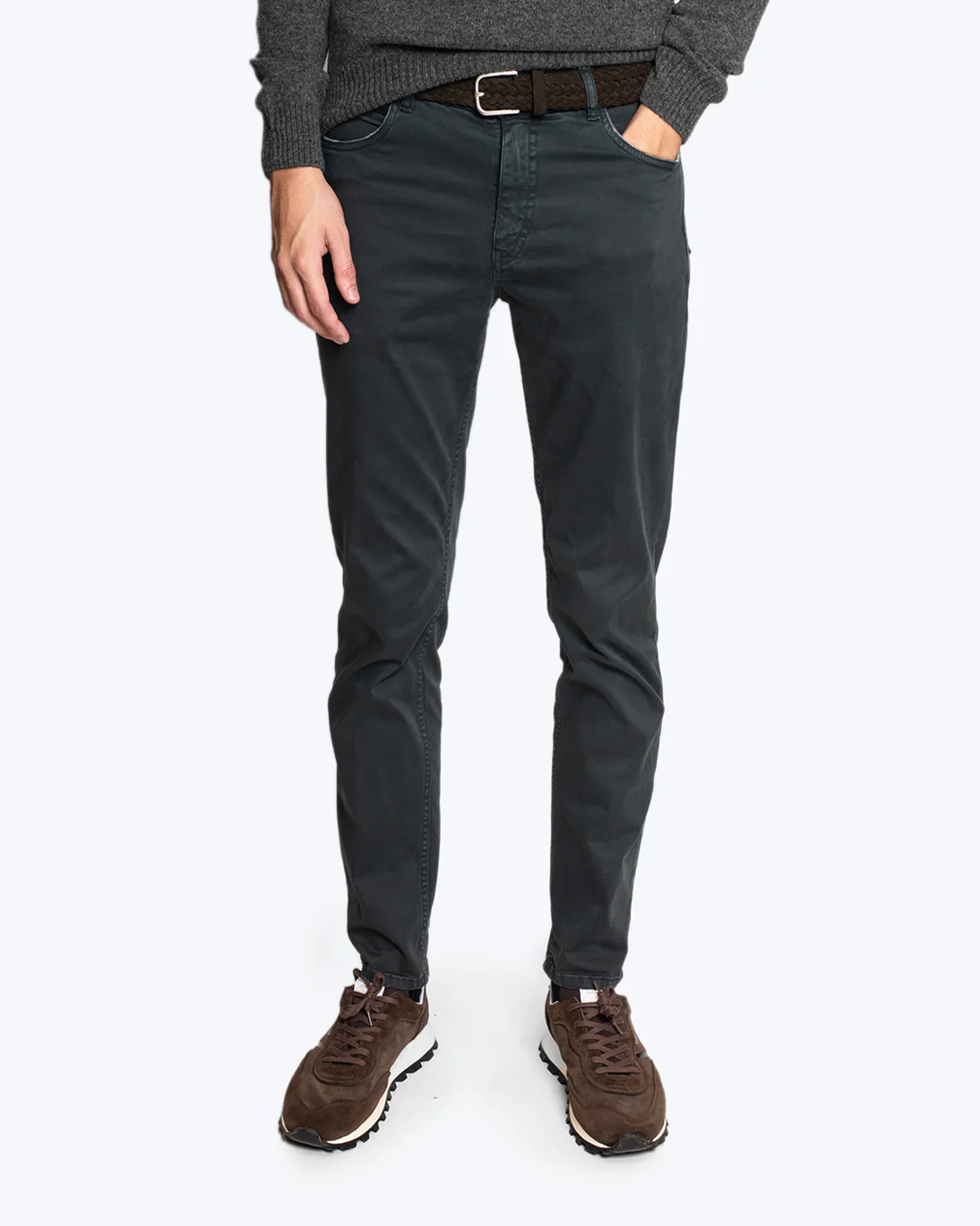 Pantalón azul grisáceo de la marca 40Weft con corte regular slim fit. La pernera se va estrechando ligeramente hasta el tobillo para estilizar la pierna, pero sin quedar ajustado.