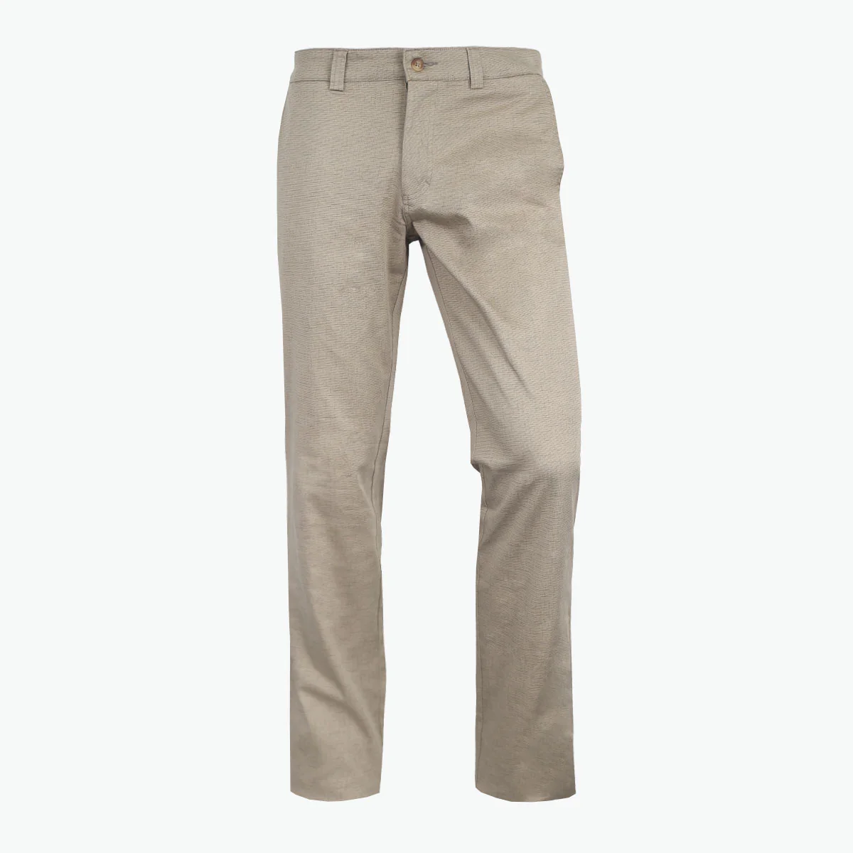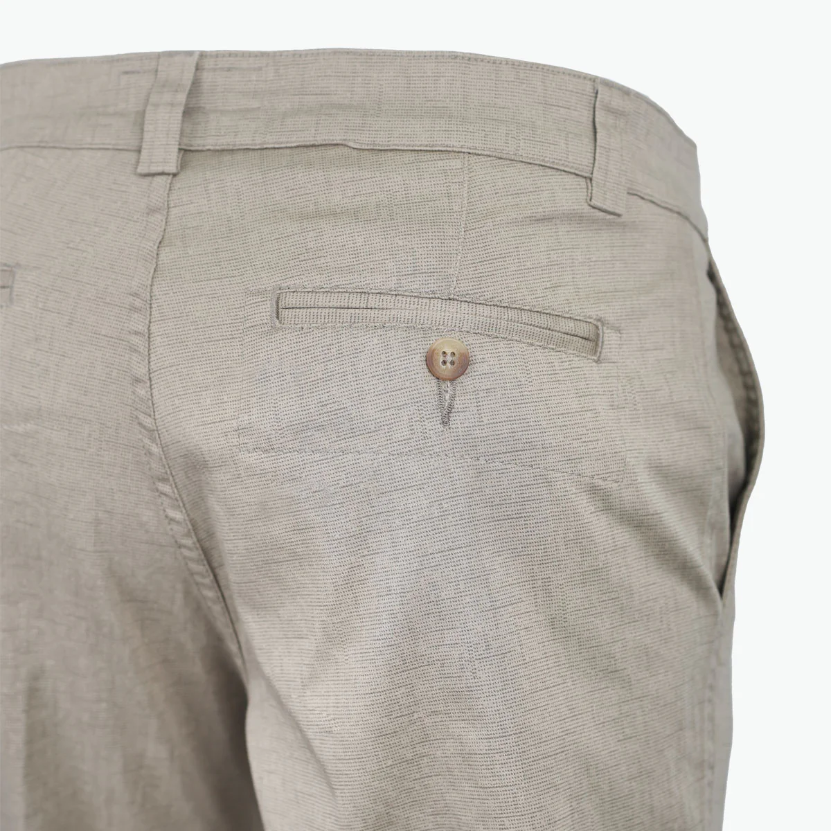 Su diseño incluye un mini print sutil en tono verde arena, que aporta textura visual sin perder discreción. Cuenta con bolsillos delanteros sesgados para fácil acceso y bolsillos traseros ribeteados con botón, además de detalles de pespuntes reforzados y presillas para cinturón que garantizan funcionalidad y resistencia.