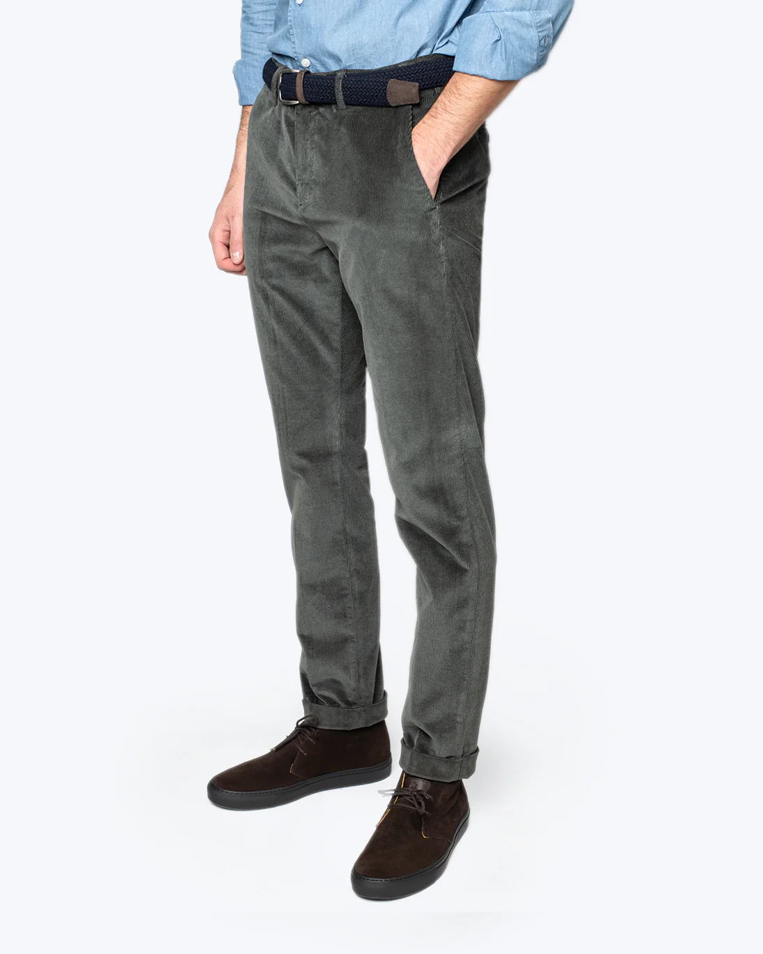 Pantalón chino de pana con vuelta de la marca Seventy en color verde grisáceo, con un corte regular slim fit. La pernera se va estrechando ligeramente hasta el tobillo para estabilizar la pierna, pero sin quedar ajustado.