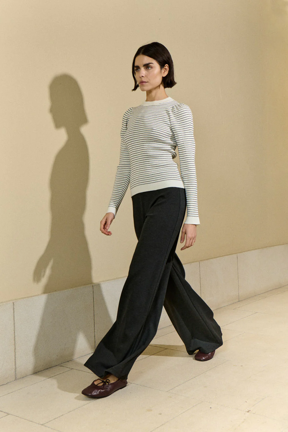 Pantalón circular confeccionado con tejido de estructura de sarga, de pierna ancha y tiro alto, con cintura elástica.