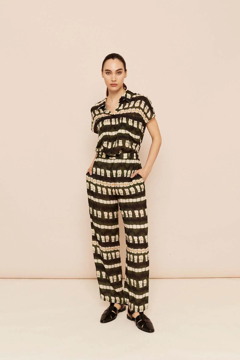 Pantalón fluido y estampado con cintura elástica. 100% Viscosa.