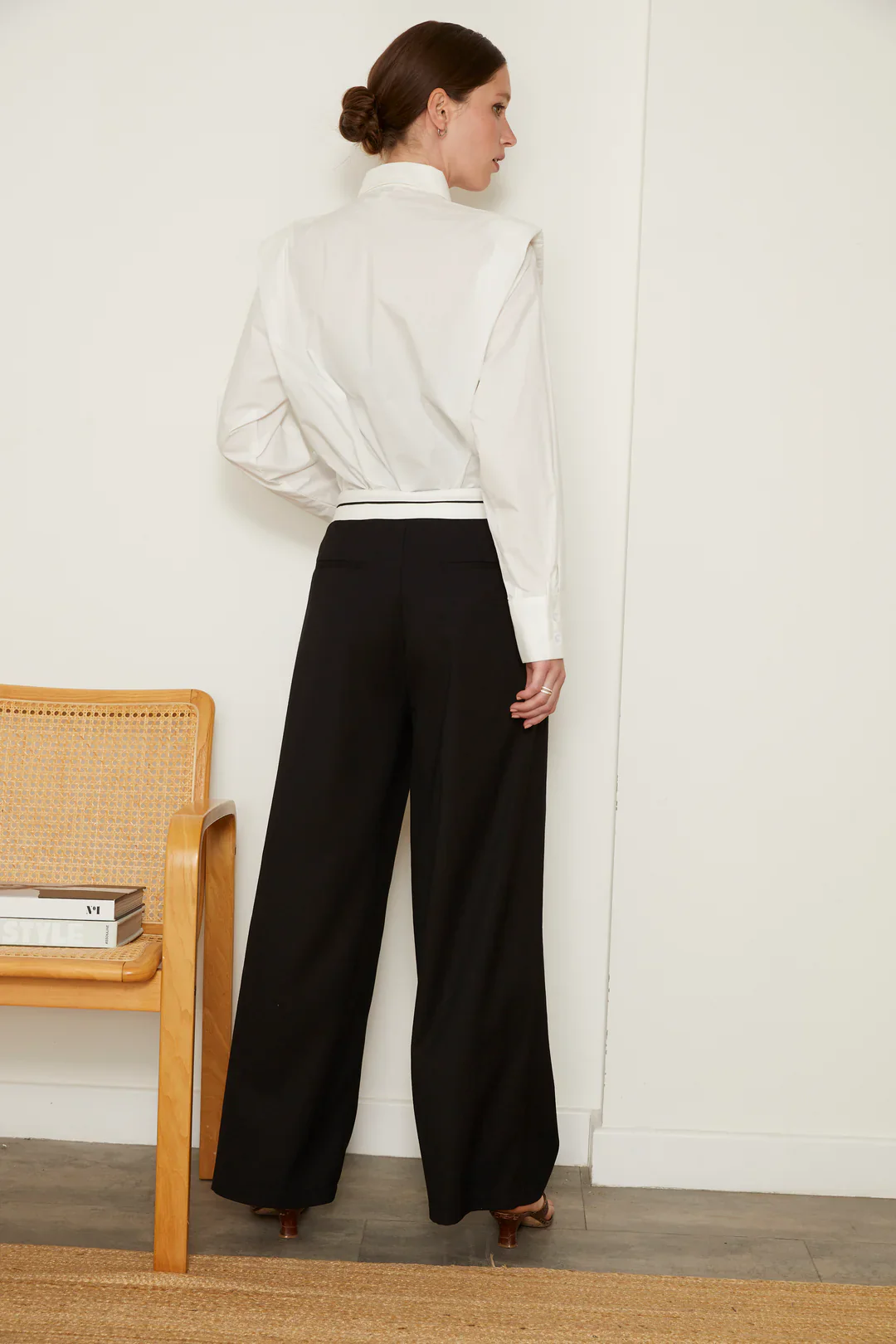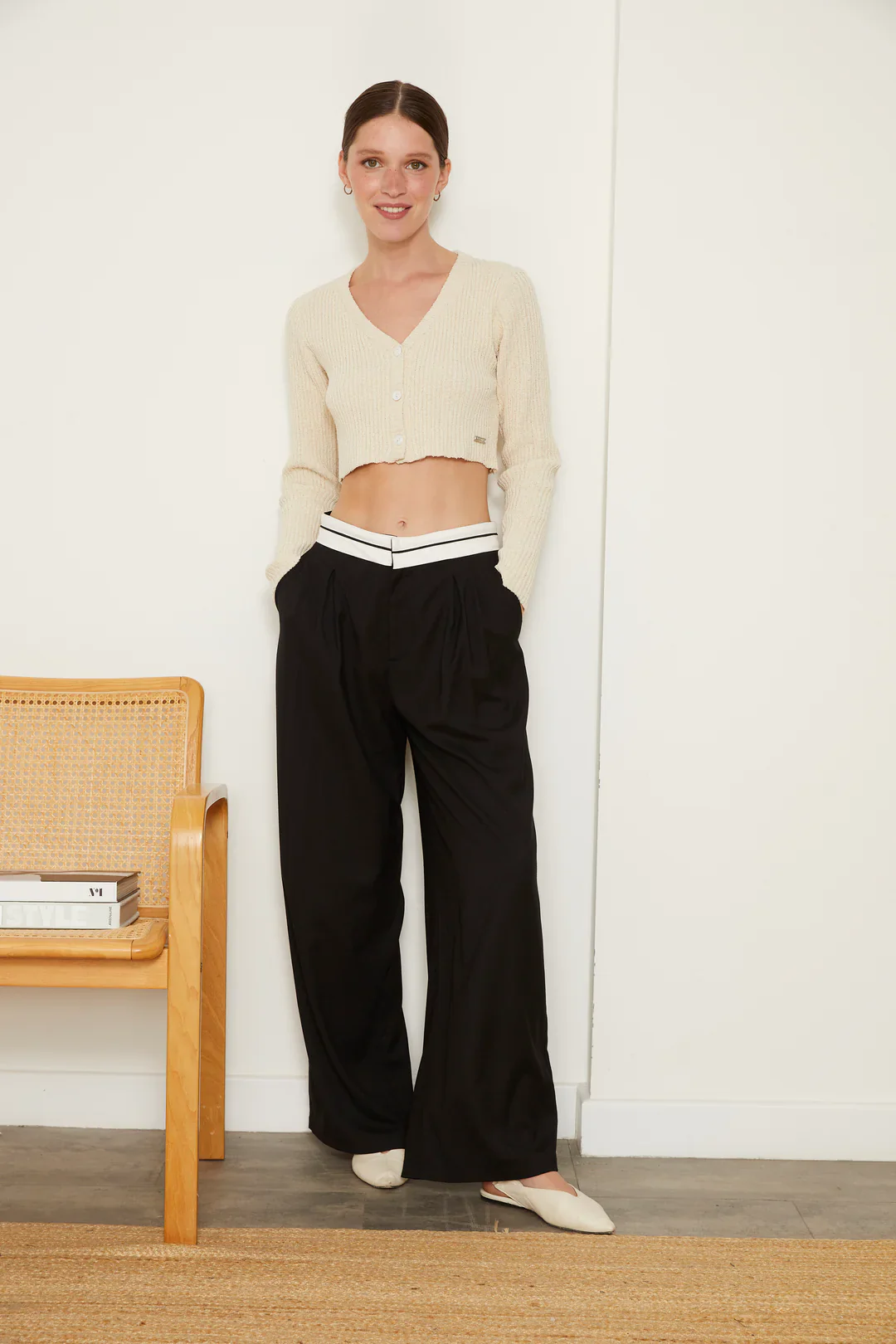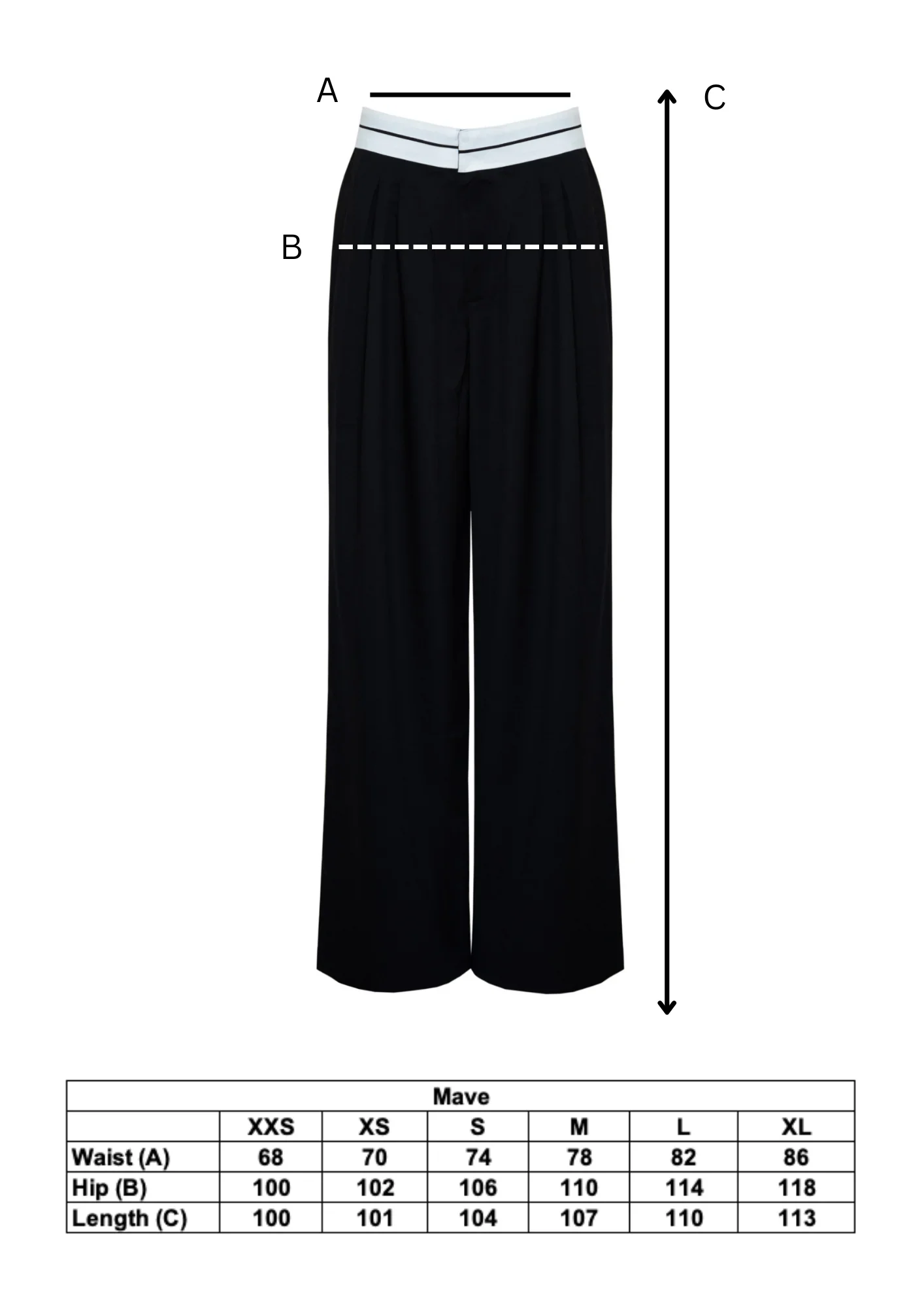 Los pantalones Mave son un modelo chic para una chica de ciudad. La cinturilla en contraste es un detalle moderno que añade singularidad al pantalón.