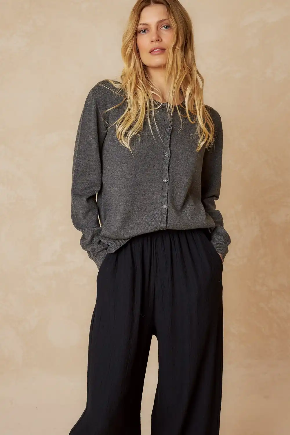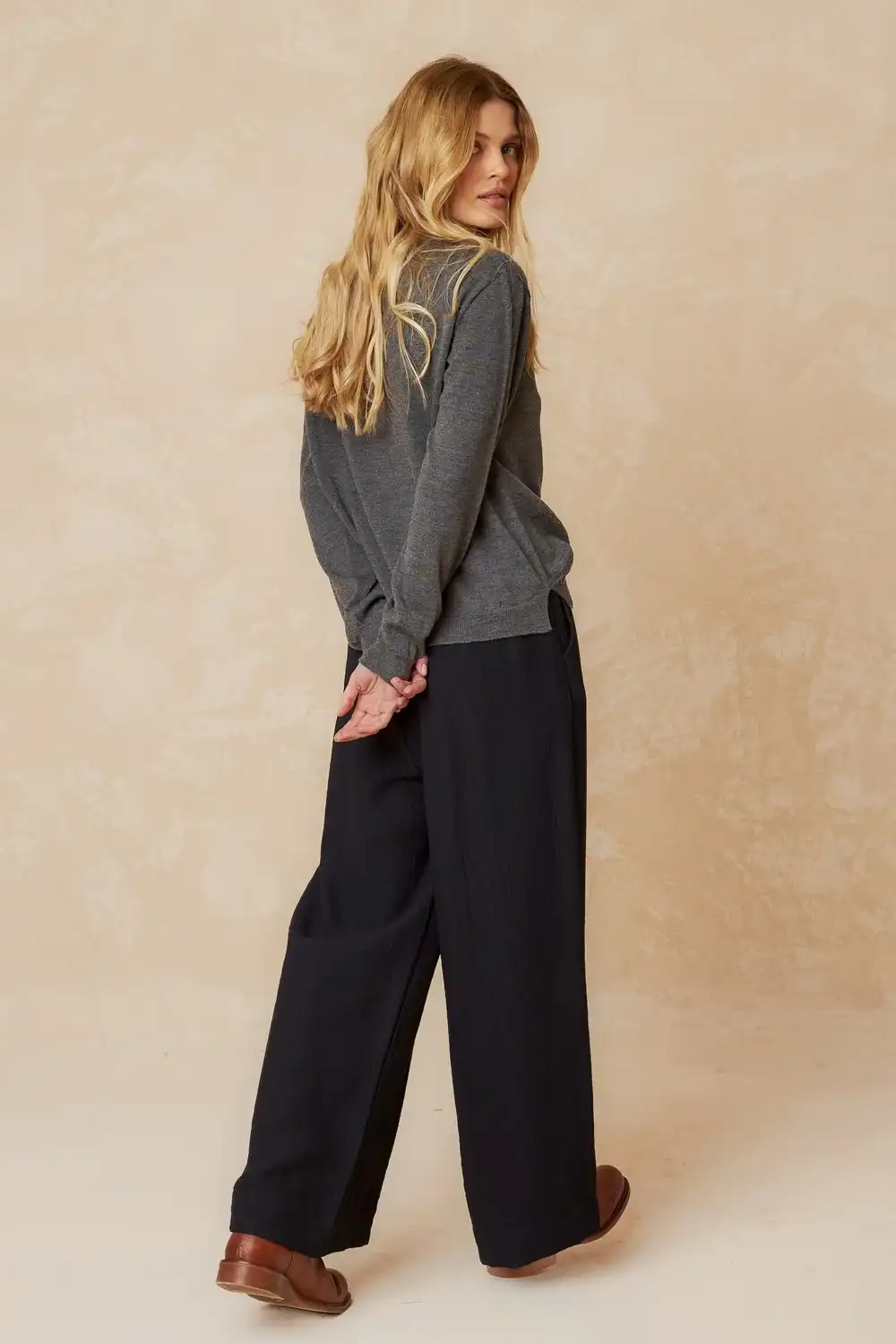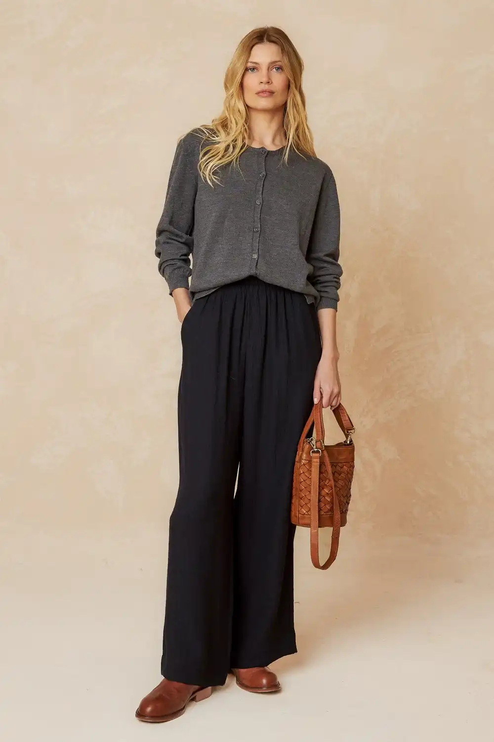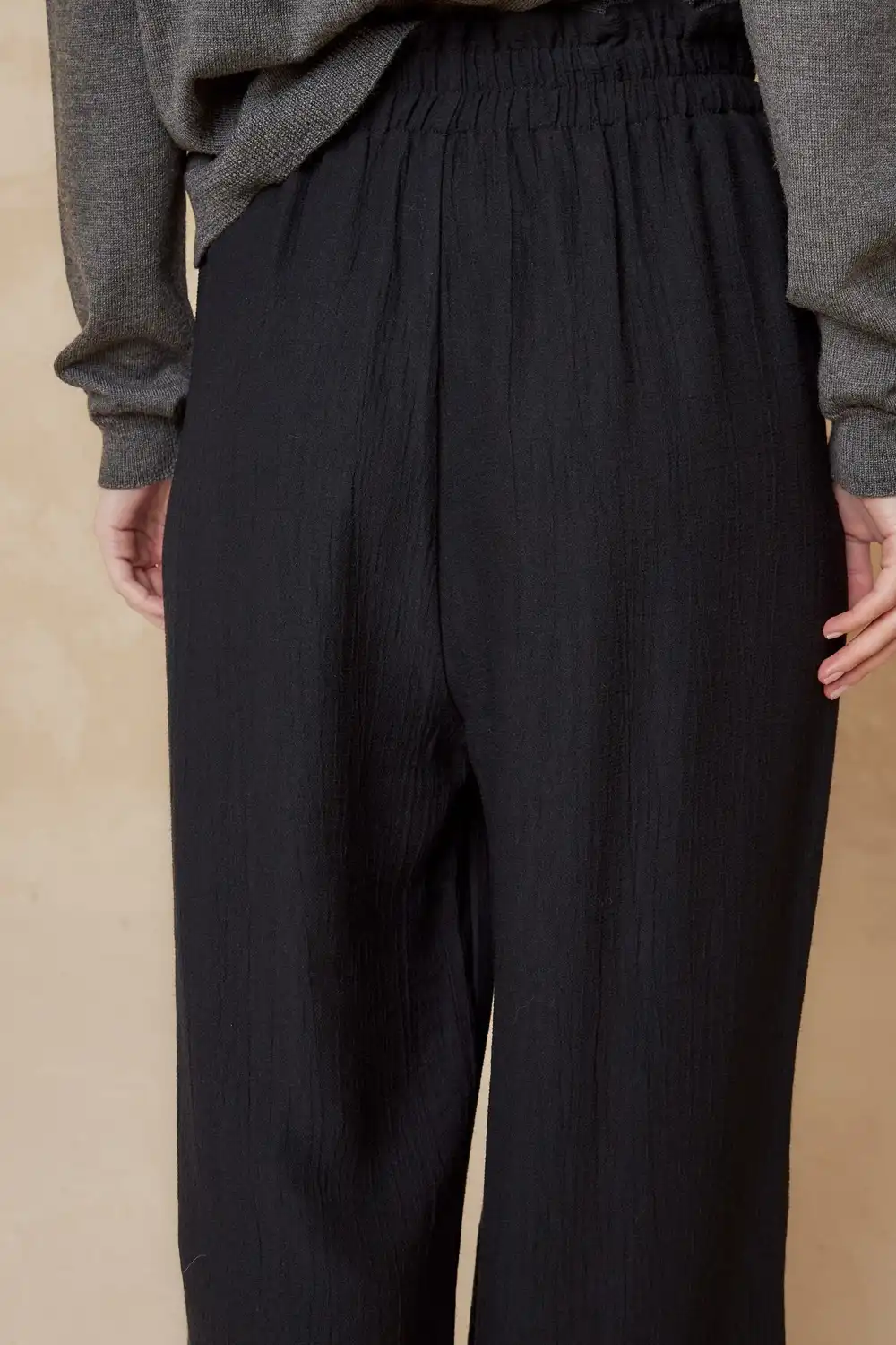 Pantalón negro, con un ajuste alto y elástico, confeccionado con un tejido de viscosa suave.