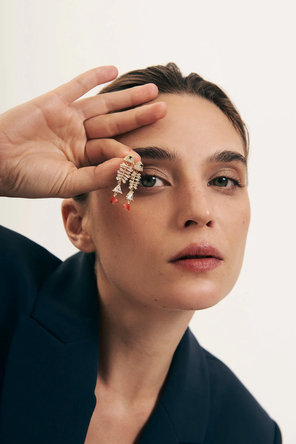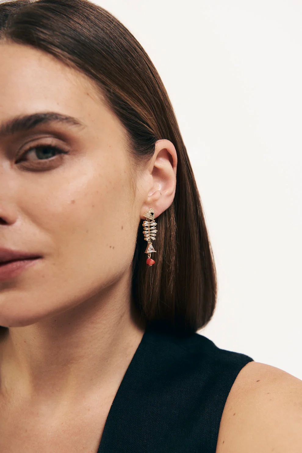 La nueva versión de nuestros BEST-SELLER!!!!! Pendientes de Latón chapado en Oro Amarillo de 18 kts con circonitas talla baguette, brillante y triangular y un coral natural colgando de la parte final del cuerpo del pez. Pendiente muy ligero. Cierre con tuerca.