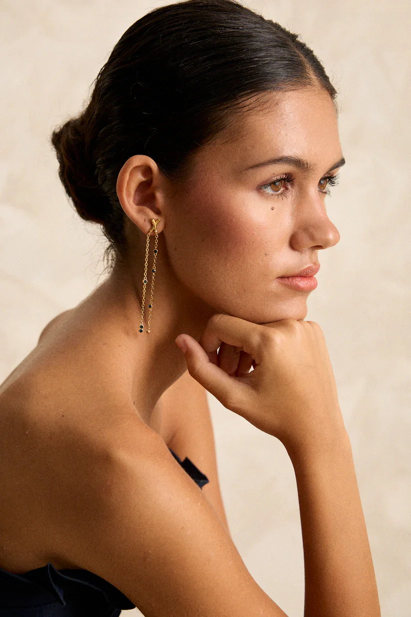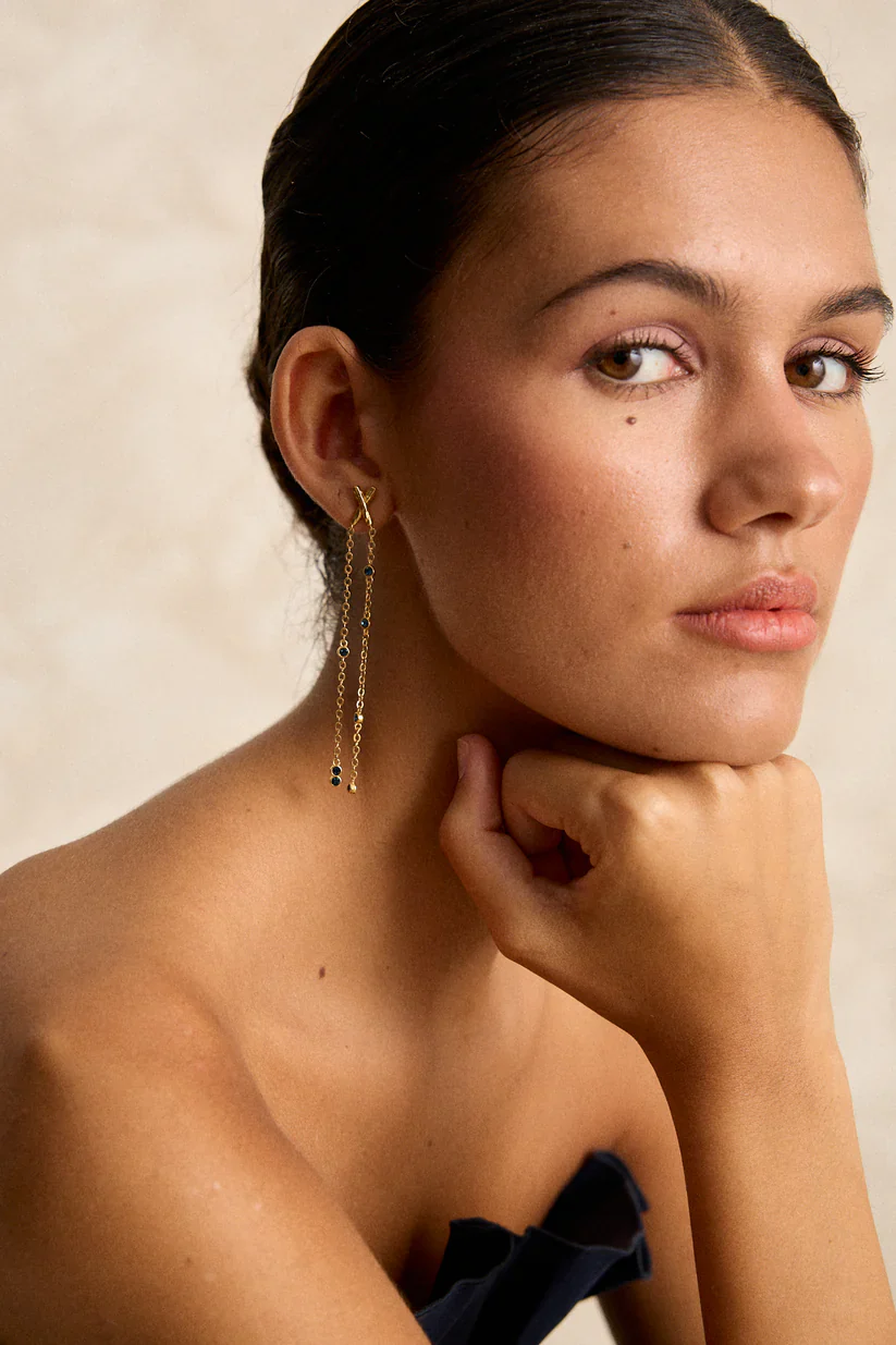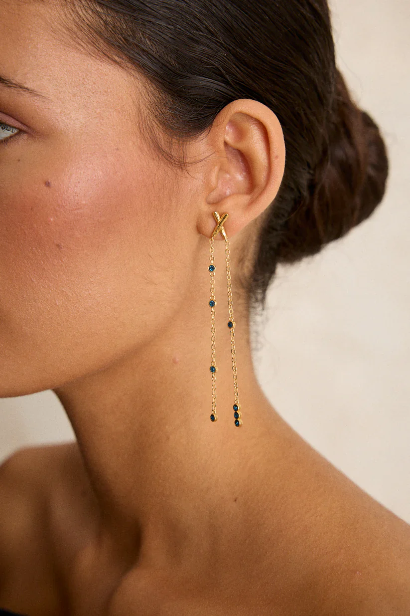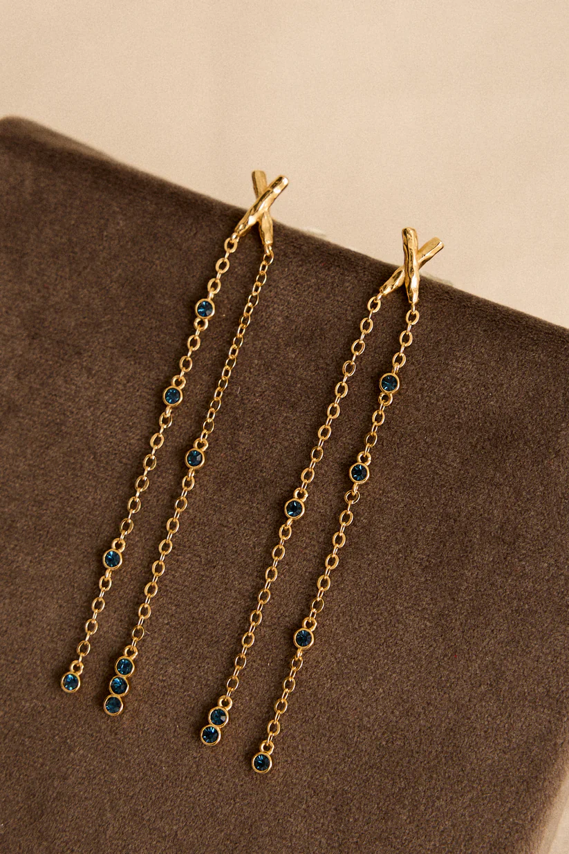 Desde cada cruz caen dos finas cadenas de oro, ligeras y elegantes, salpicadas de cristales checos en tono azul zafiro.