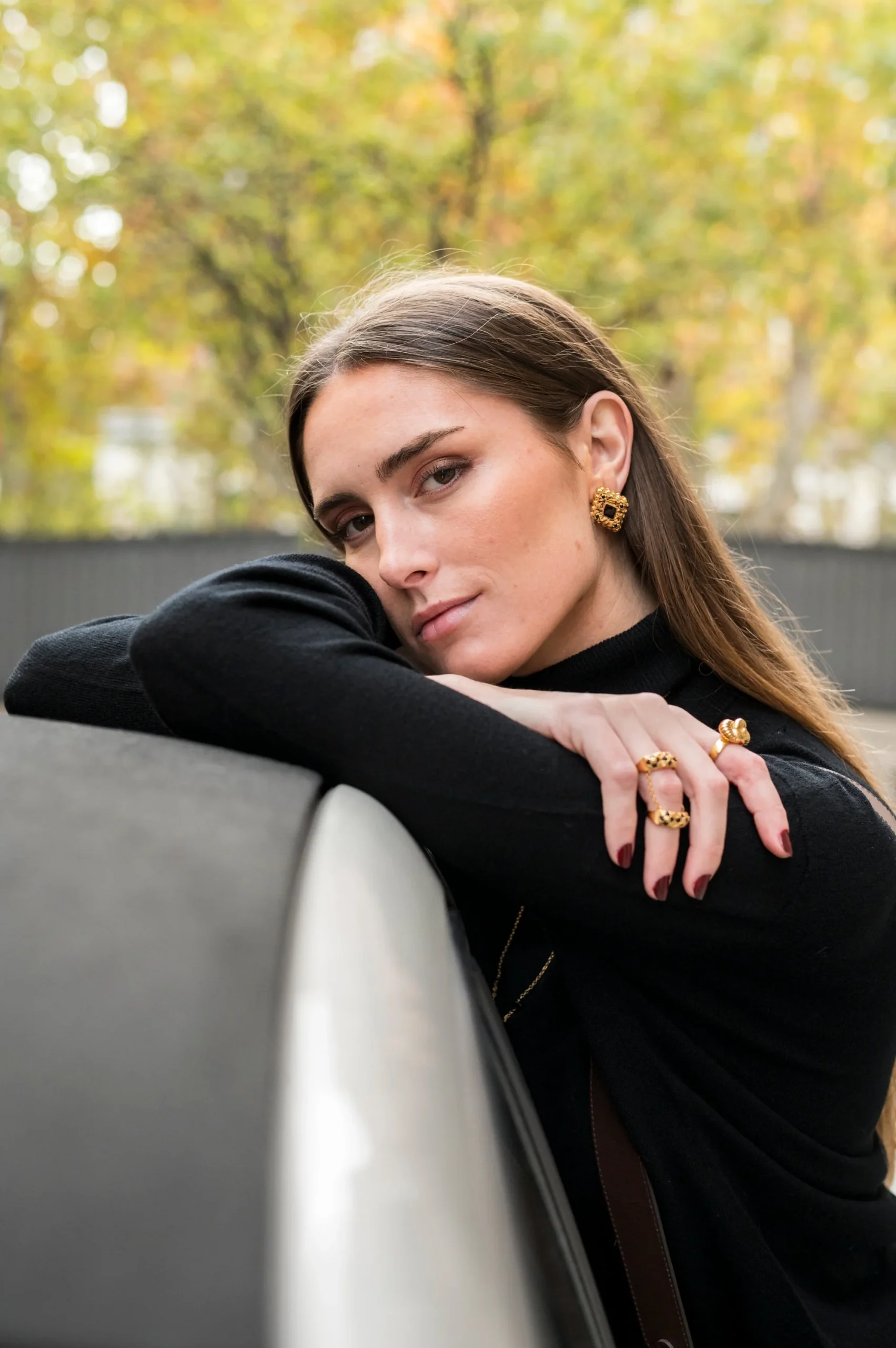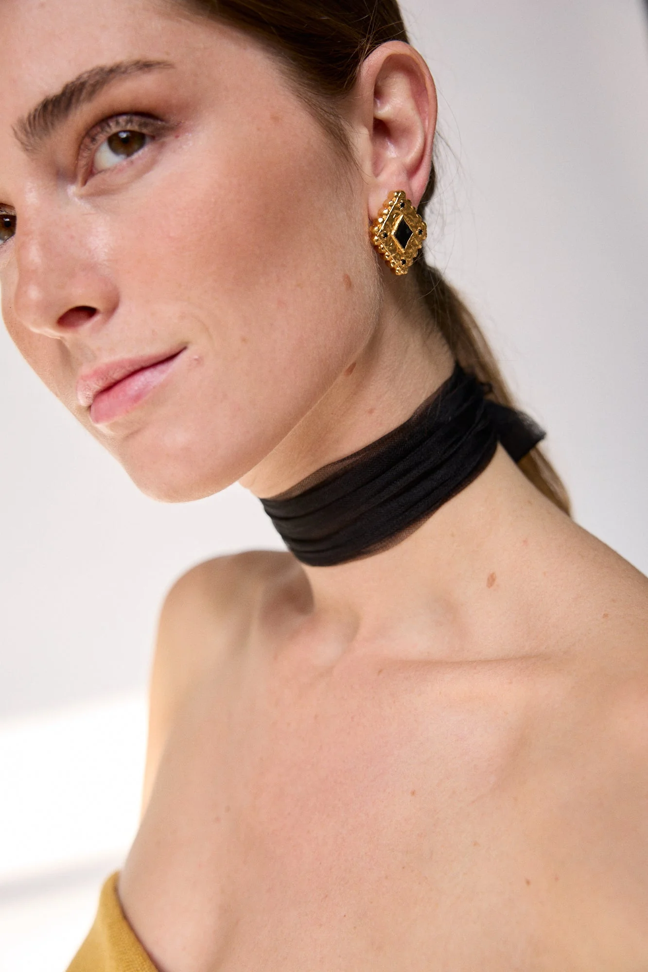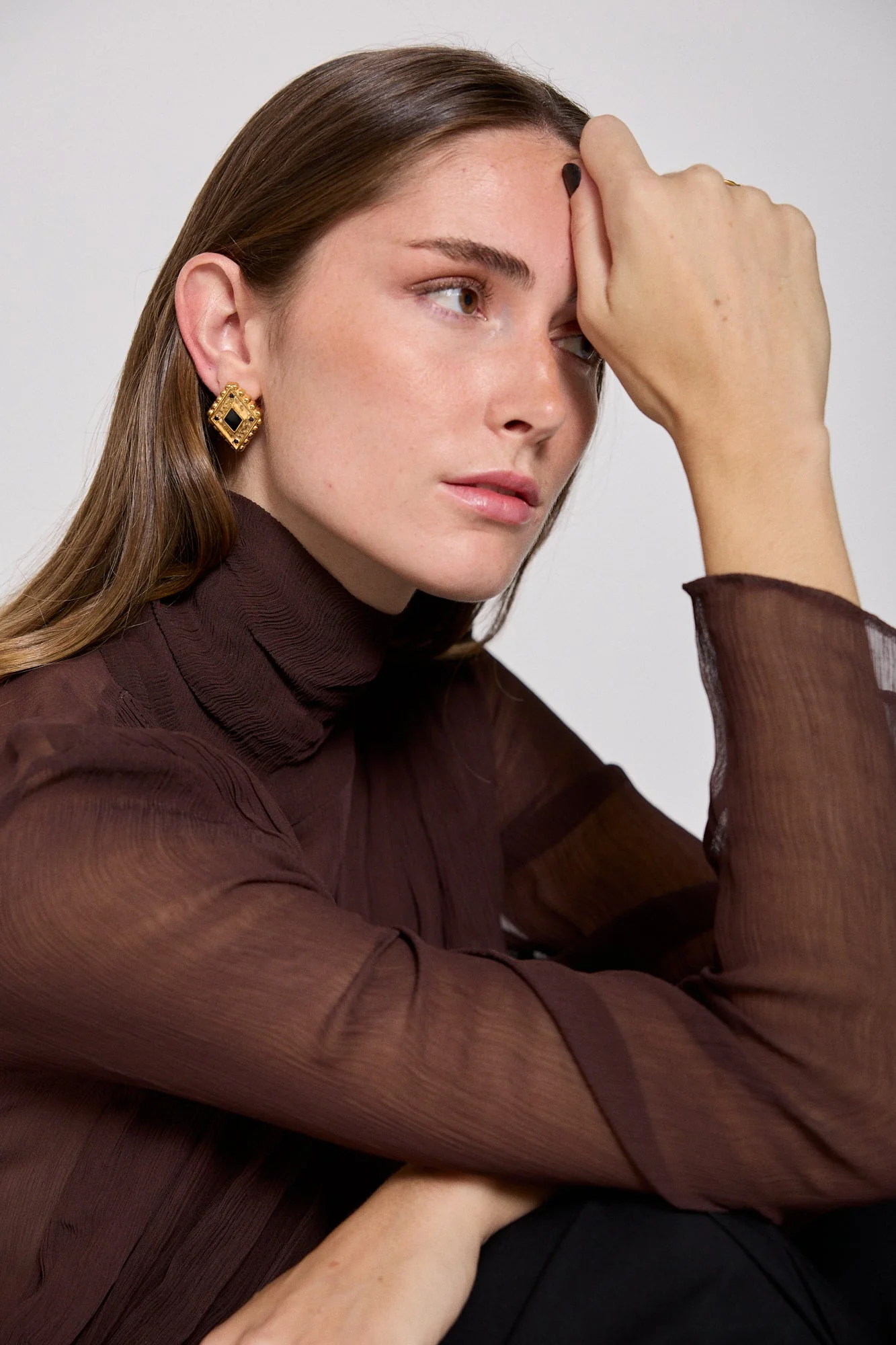Pieza de latón bañada en oro de 24 kt, cuenta con cuatro circonitas negras en los bordes y un rombo esmaltado a mano. El efecto de la pieza central es martelé.