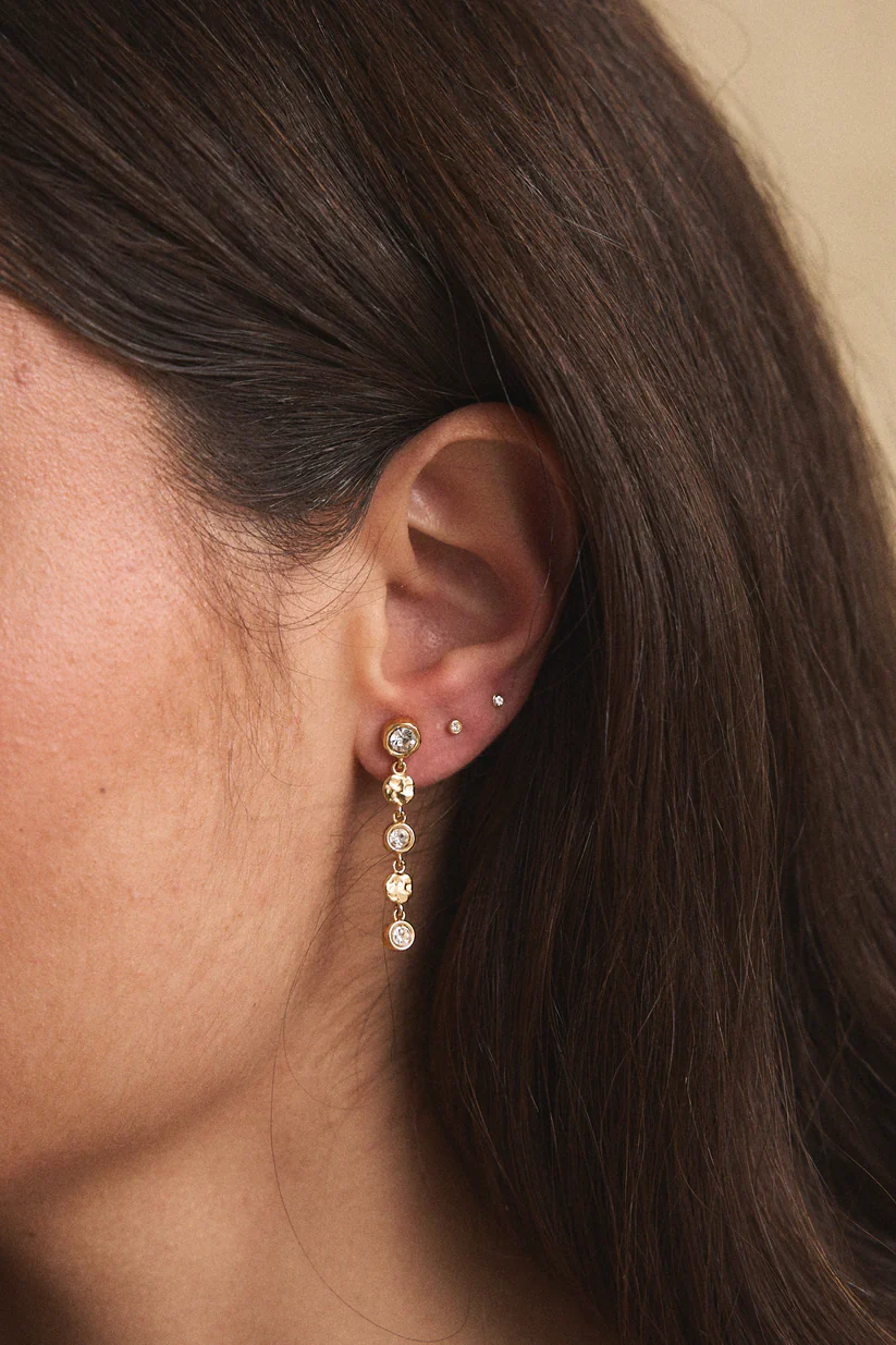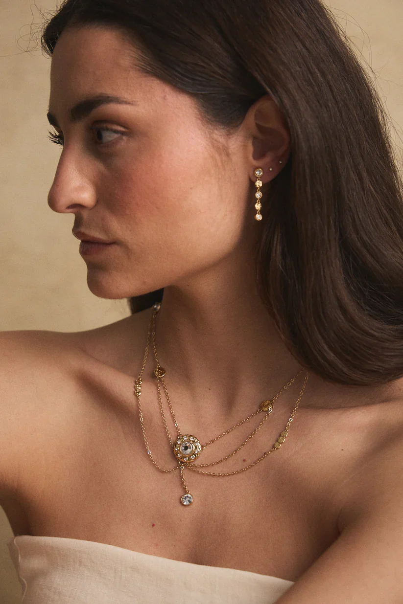 Una de las piezas más especiales de este colección. Los pendientes Royale están compuesto de cristal y formas orgánicas con estilo martelé, que se encadenan y caen con discreción, lo que los convierte en una pieza versátil para aportar elegancia en cualquier evento.