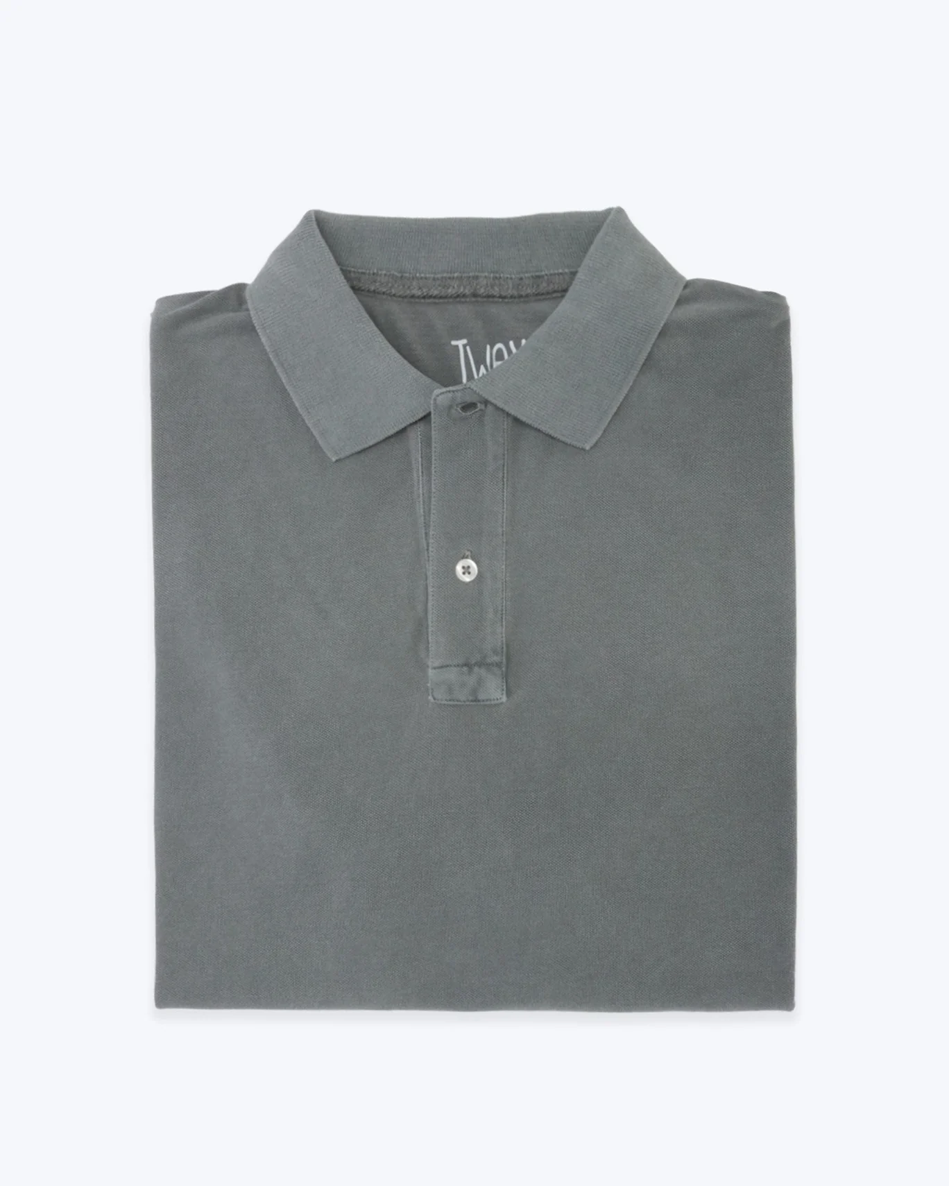 Polo de manga corta de piqué, de la marca Tway, en color gris. Presenta cierre frontal con dos botones.