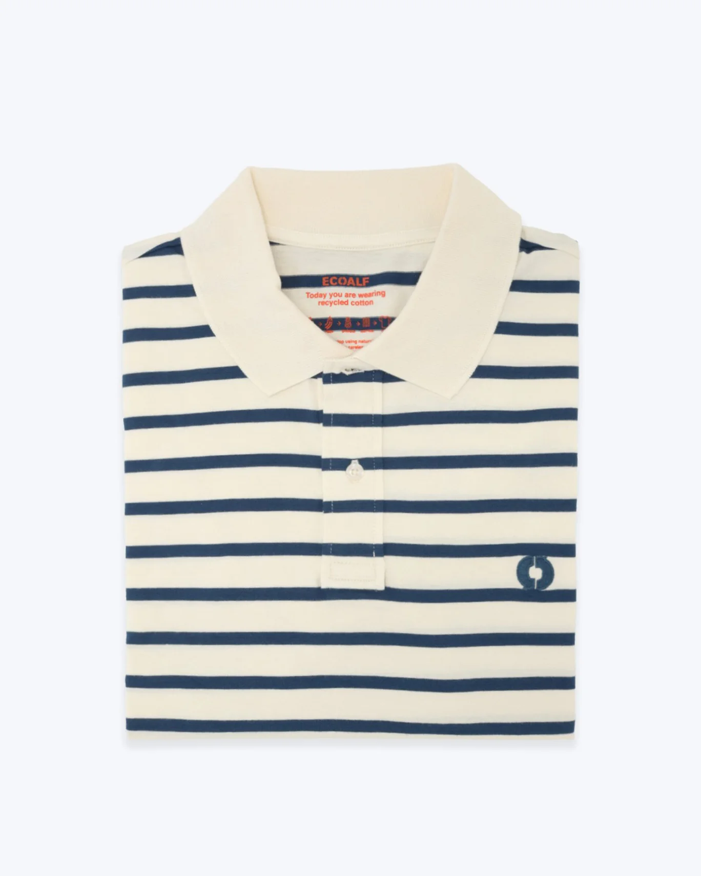 Polo manga corta de la marca Ecoalf, en tejido jersey de color beige con rayas azules. Cuello clásico, cierre frontal con dos botones y bolsillo a la altura del pecho.