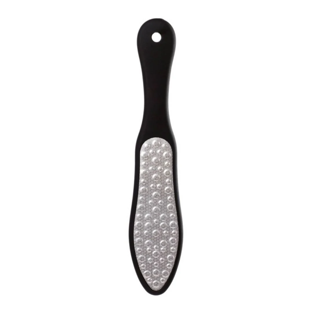 El Raspacallos metálico de doble cara color negro con mango ergonómico de material gomoso para un mejor agarre y muy agradable al tacto. Placas metálicas de gran poder de abrasión y larga duración. Fácil limpieza y desinfección.