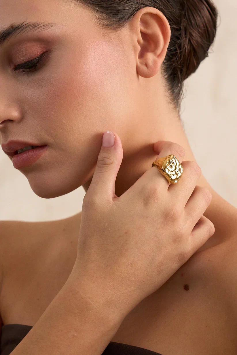 Cada anillo está elaborado a mano en latón de alta calidad y chapado en oro de 24 y 18 quilates, con un acabado martillado artesanal que refleja la luz en matices cálidos y naturales. Su volumen sólido y diseño escultórico hacen de esta pieza un sello de carácter, perfecto para quienes buscan joyas con presencia y significado.