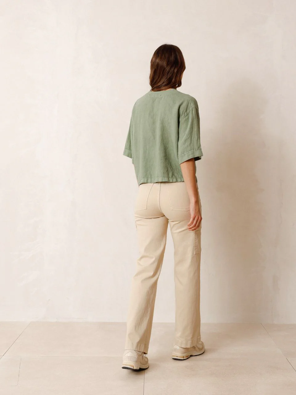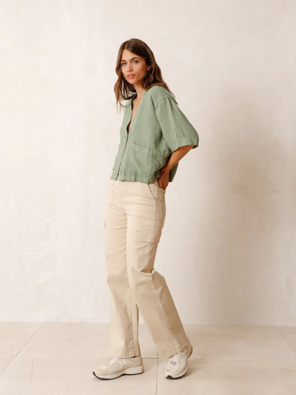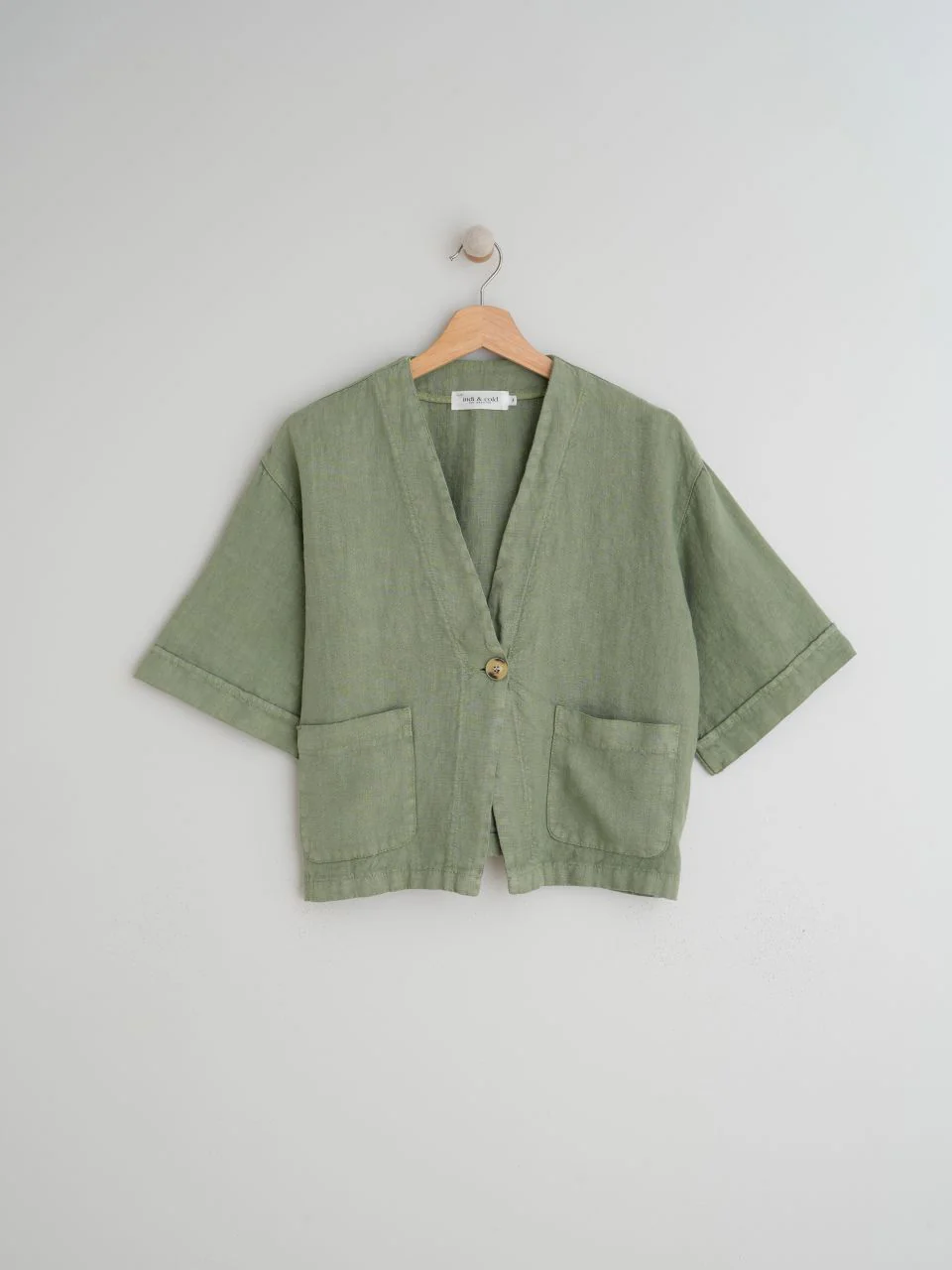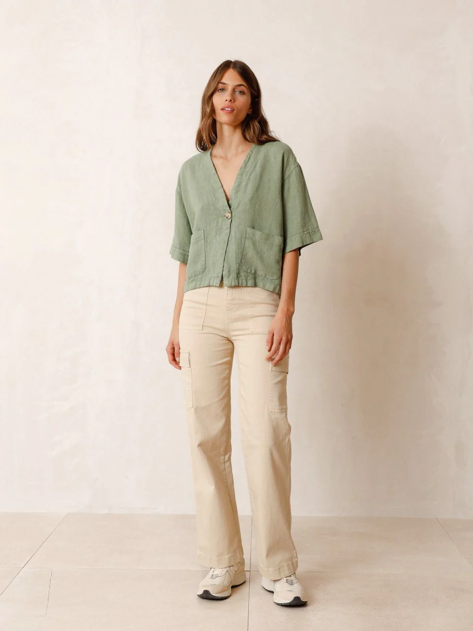 SOBRECAMISA CROP EN LINO – Cuello acabado V con hombro caído y manga japonesa – Cierre de botón en el delantero – Bolsillos plastrón en el delantero – Tejido de lino 100% y tinte en prenda – Relaxed fit – Made in Spain – Largo total de prenda desde hombro: 55cm / Ancho de pecho: 55cm / Ancho de bajo: 55cm. Las medidas se realizan con la prenda colocada en plano. – Tallaje: Cada prenda aumenta de largo 1 cm por talla . En los contornos de pecho y bajo, el salto de tallaje es de 2 cm por talla.