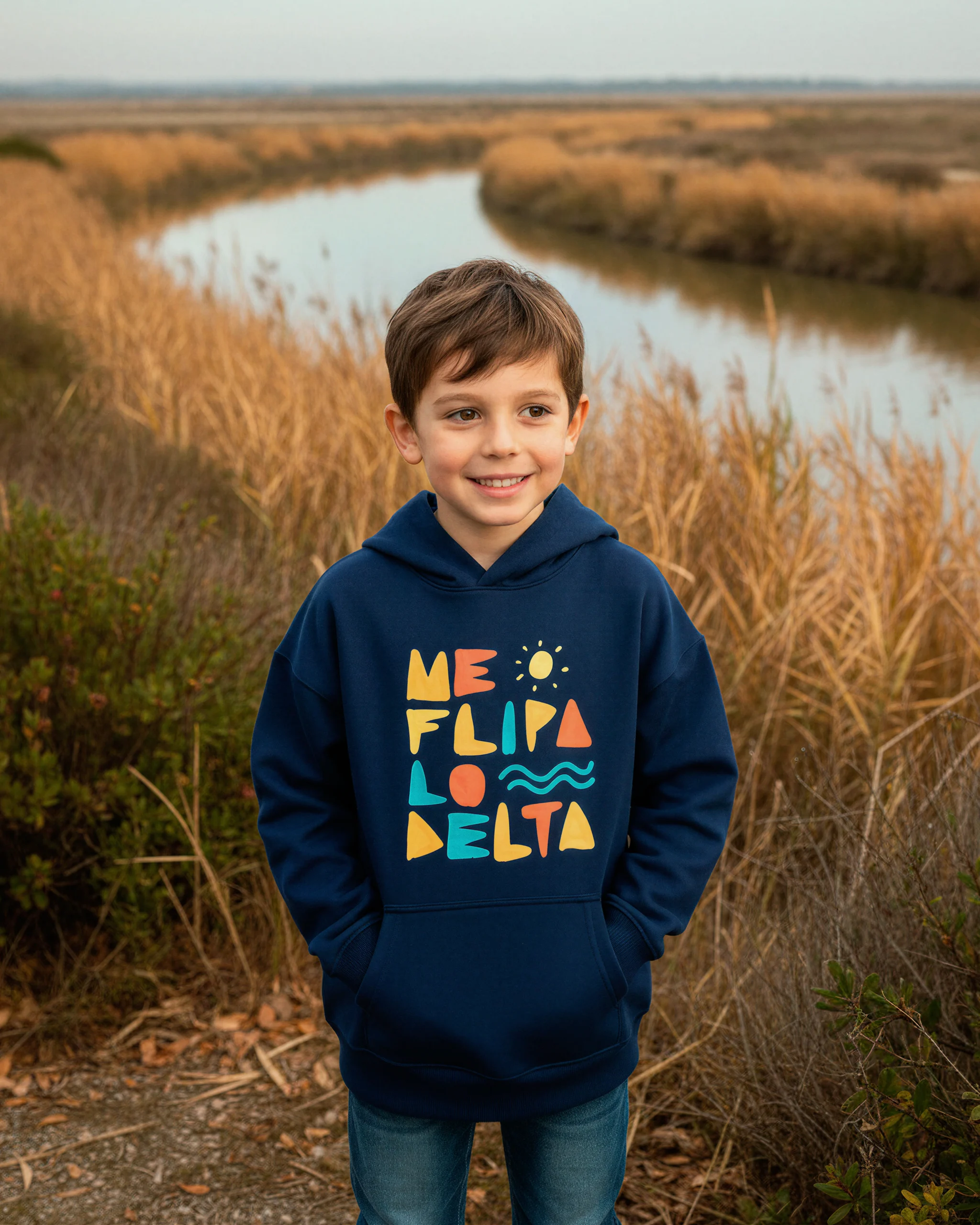 Sudadera unisex Me Flipa lo Delta en color azul marino con estampado Me Flipa lo Delta. Disponible en las tallas de 1 año a 10 años