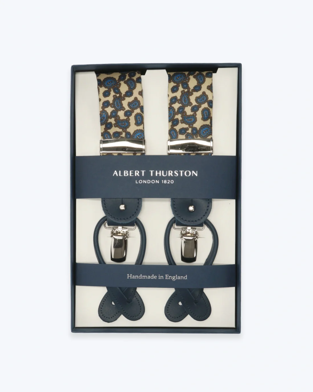 Tirantes de la marca Albert Thurston en color beige con estampado de amebas azules.