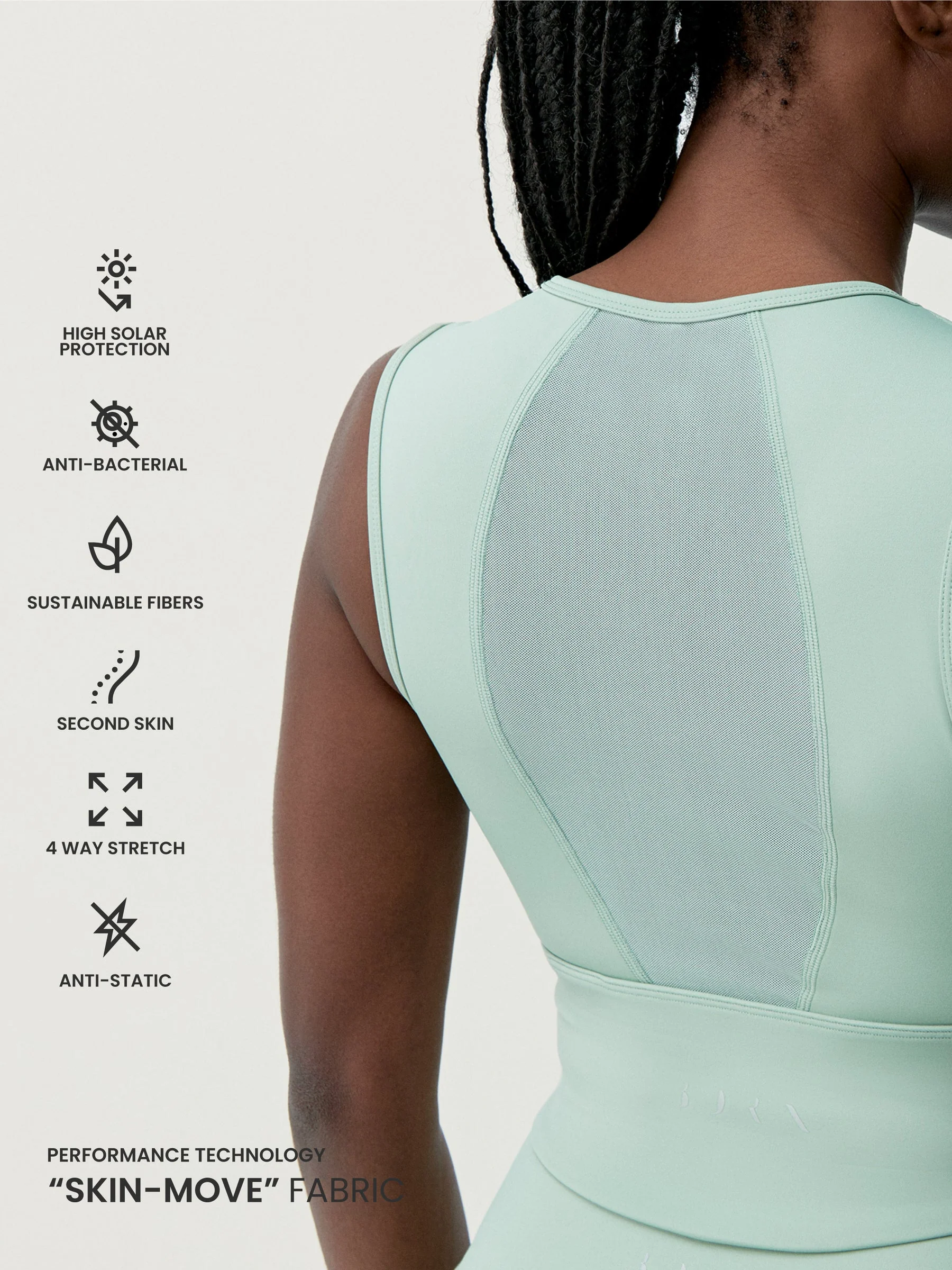 Crop top con un diseño sobrio y muy elegante, espalda con pieza de mesh. Sujeción media – alta. Con copas fácilmente extraíbles. Tejido “Skin_Move”.