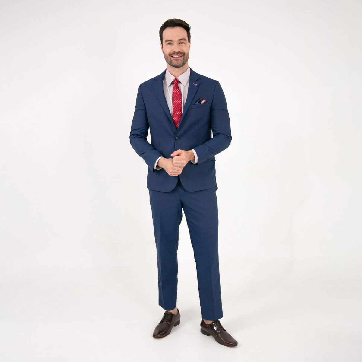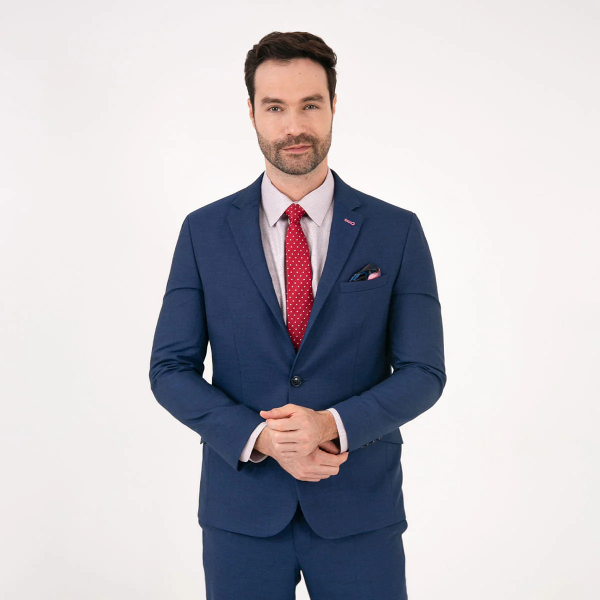 Traje 1 boton sin prenses diseño dobby, silueta slim, composicion 80% poliéster – 20% viscosa, con contrastes internos y diseño vanguardista que te daran un toque de elegancia y estilo.