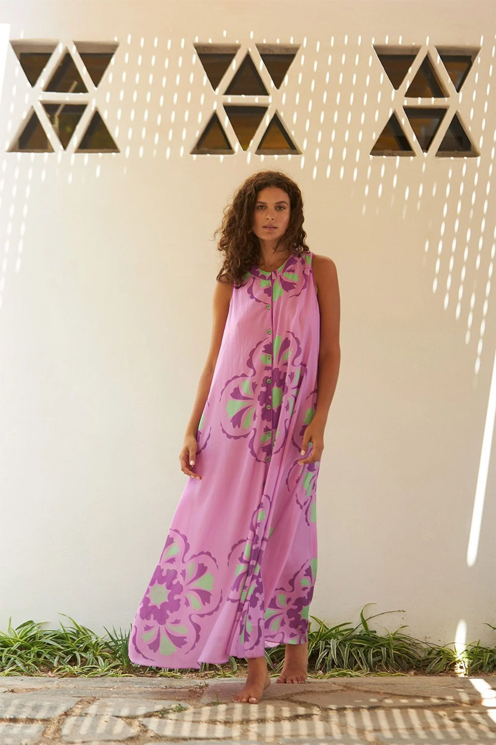 Vestido largo sin mangas, con botones en la parte delantera y escote redondo. Una opción súper cómoda que sabe cómo se siente el verano. COMPOSICIÓN: 100% TENCEL. Es recomendable lavar a mano. No usar secadora.
