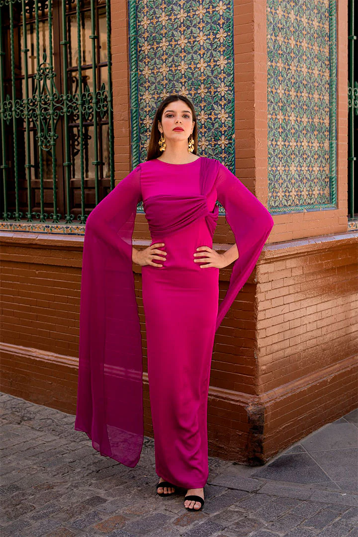 Vestido largo, color buganvilla. Ajustado a la silueta combinado con las mangas de gasa.