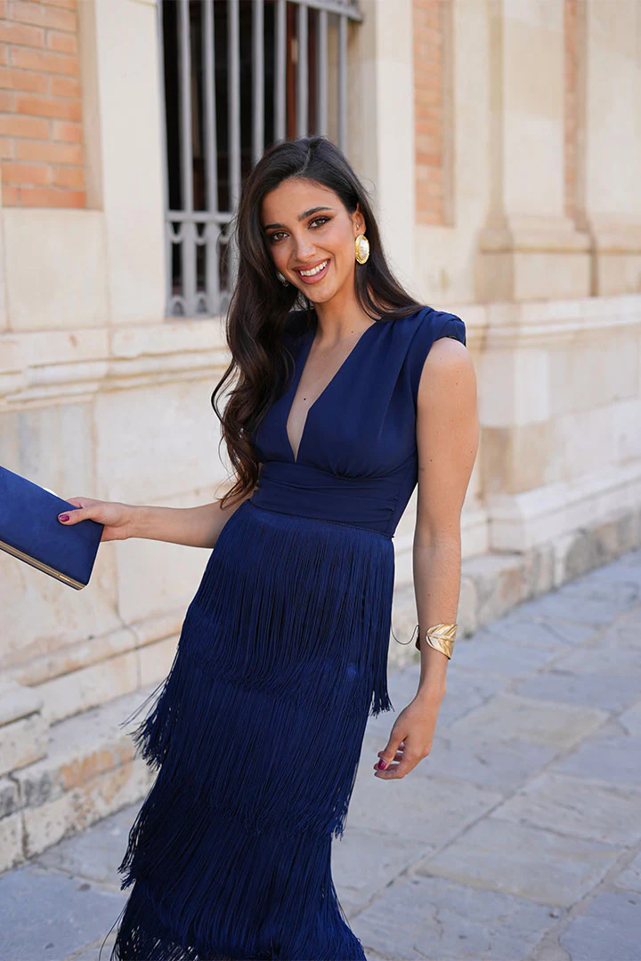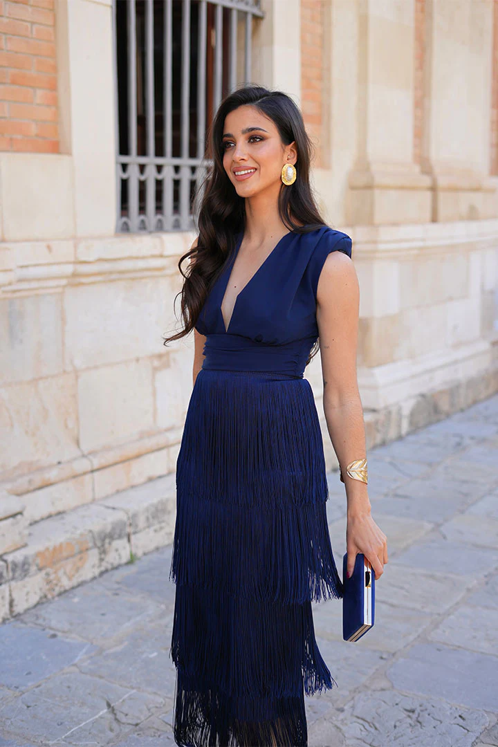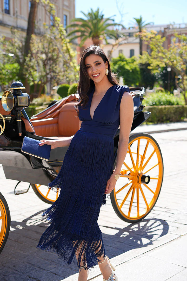 Vestido de flecos, midi , tirantes , escote de pico, totalmente cerrado en la espalda con cremallera invisible.