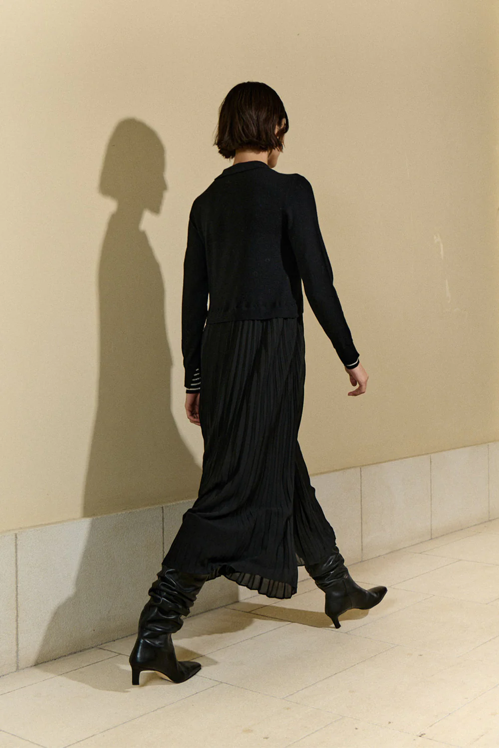 Vestido de cuello polo con cuerpo de punto y falda plisada de tejido plano con forro interior. Tapeta con botones a tono y puños dobles con una tira a rayas en contraste crudo en el interior. Confeccionado en galga 12 y completamente minvado.