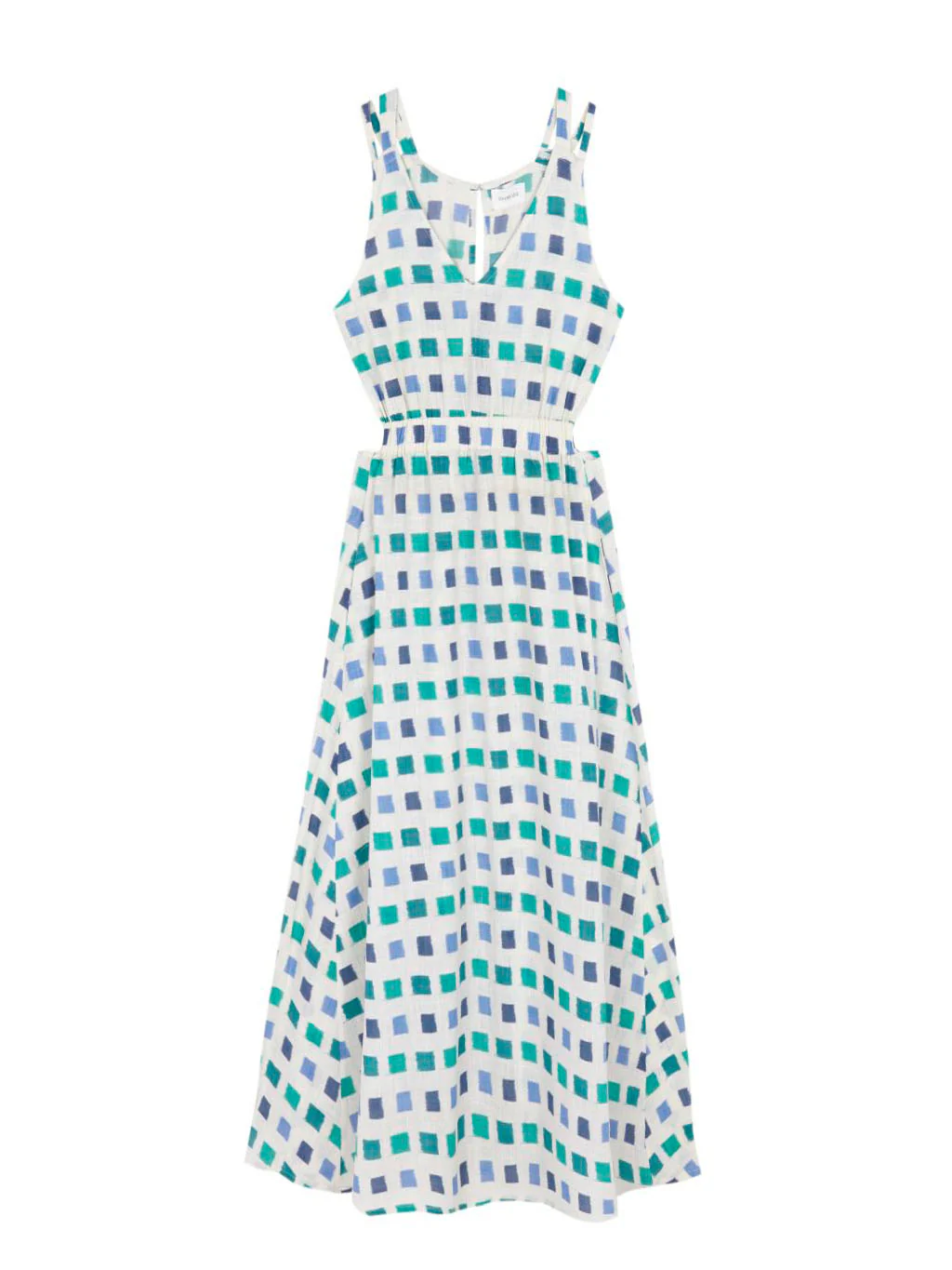 Vestido largo forrado de doble tirante y cut-outs laterales. Cintura con goma para una mejor adaptación y con bolsillos a los lados. Cierre con cremallera trasera.
