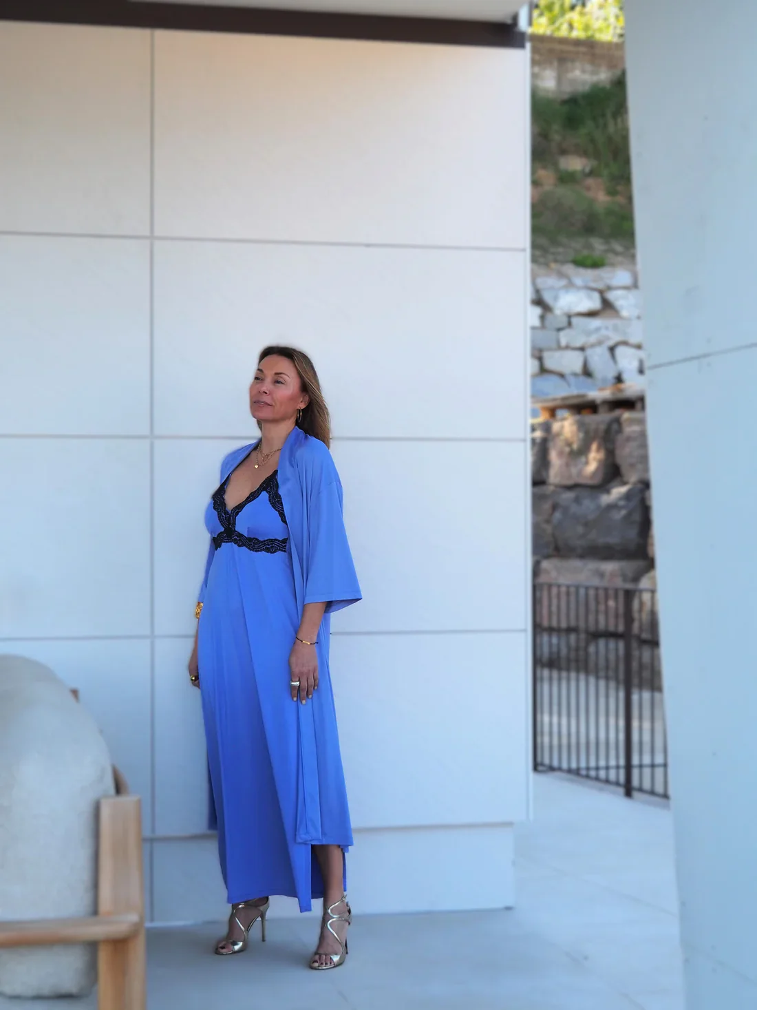 El detalle de blonda en el escote y bajo el pecho añade un aire romántico y refinado, mientras que las aberturas laterales en la falda aportan movimiento y un toque de sensualidad, perfecto para eventos especiales o noches de verano.