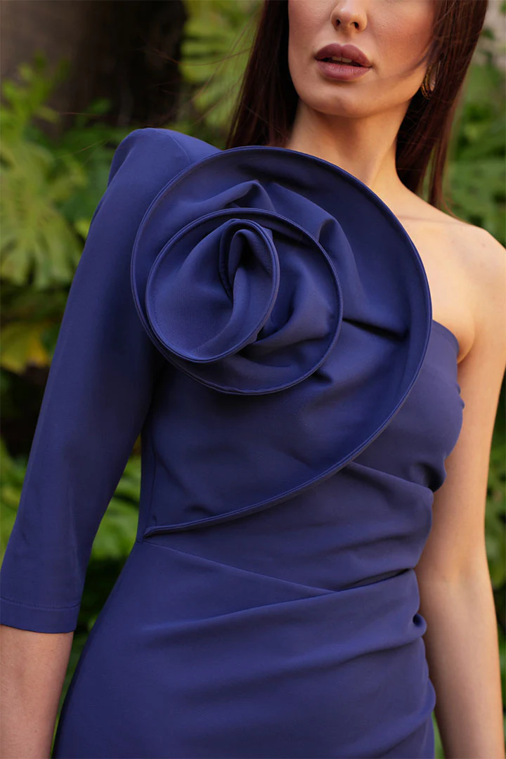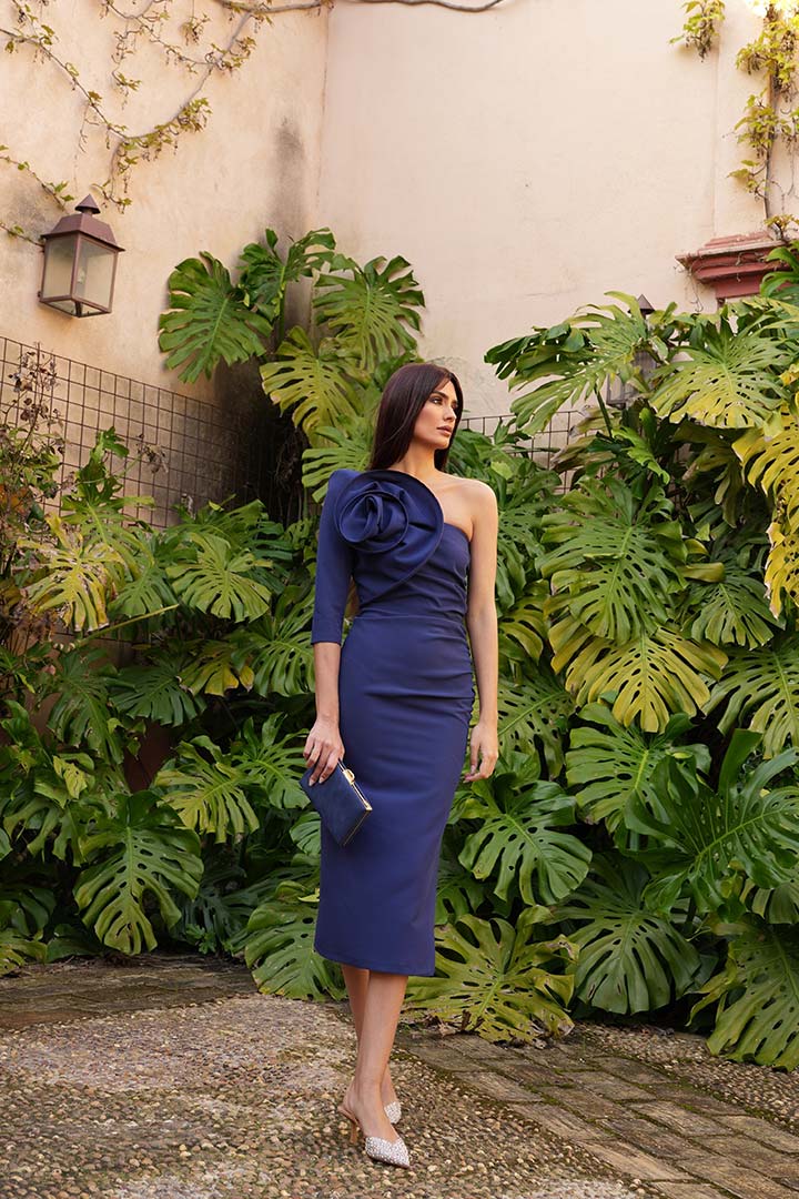 Un elegante y sexy vestido confeccionado en crepe entubado con escote palabra de honor con una manga que se amolda al cuerpo marcando la figura femenina.