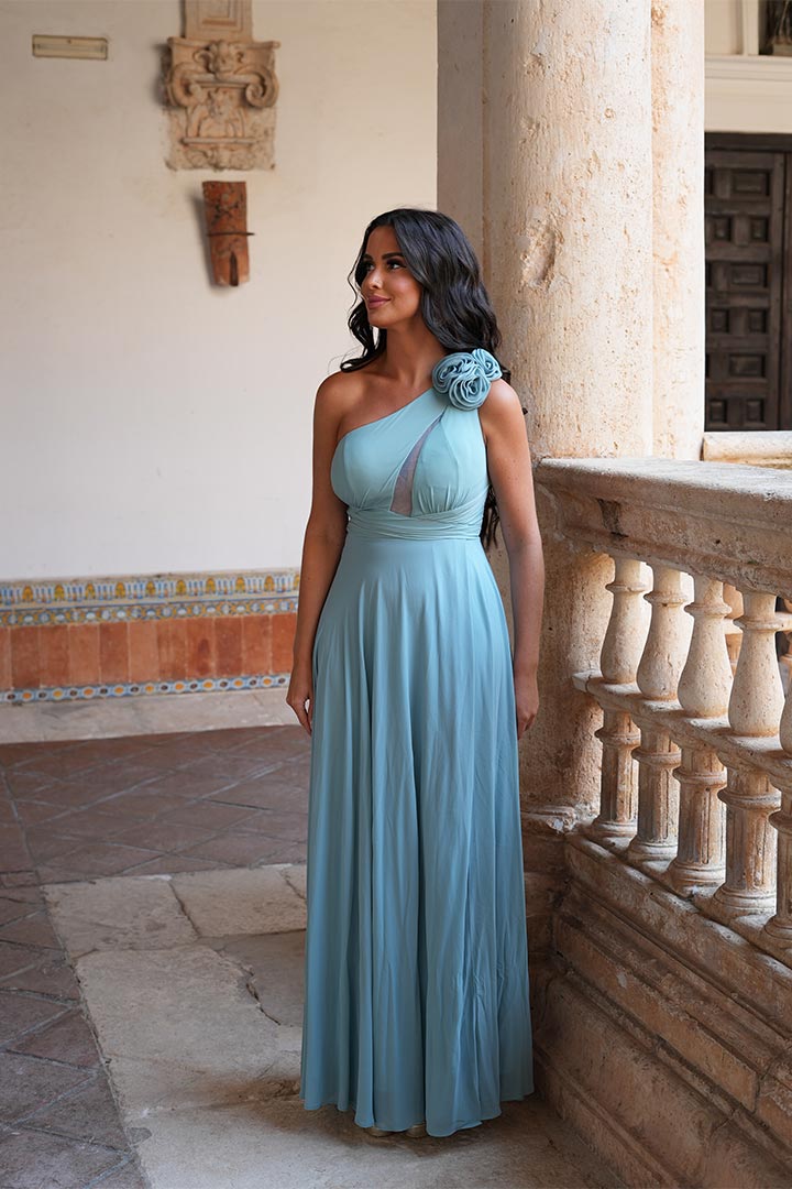 Vestido largo asimétrico, material de gasa fluida , largo para los eventos mas elegantes.