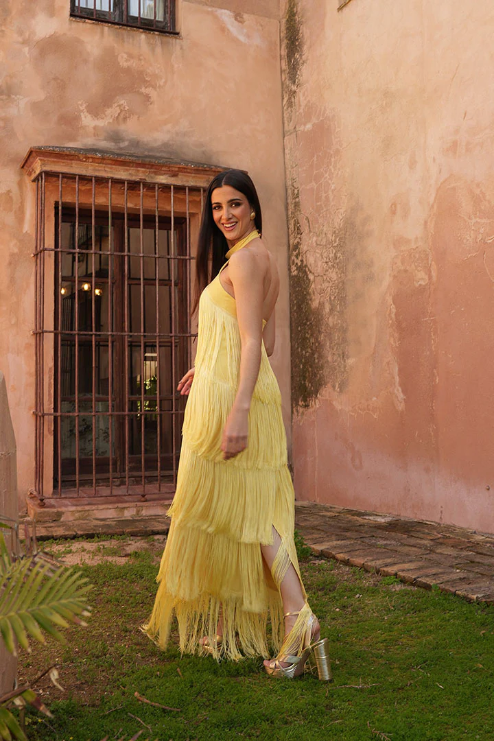 Vestido de flecos, realizado totalmente a mano por modistas, fabricado en España. Anudado al cuello con botón. Cremallera invisible trasera.