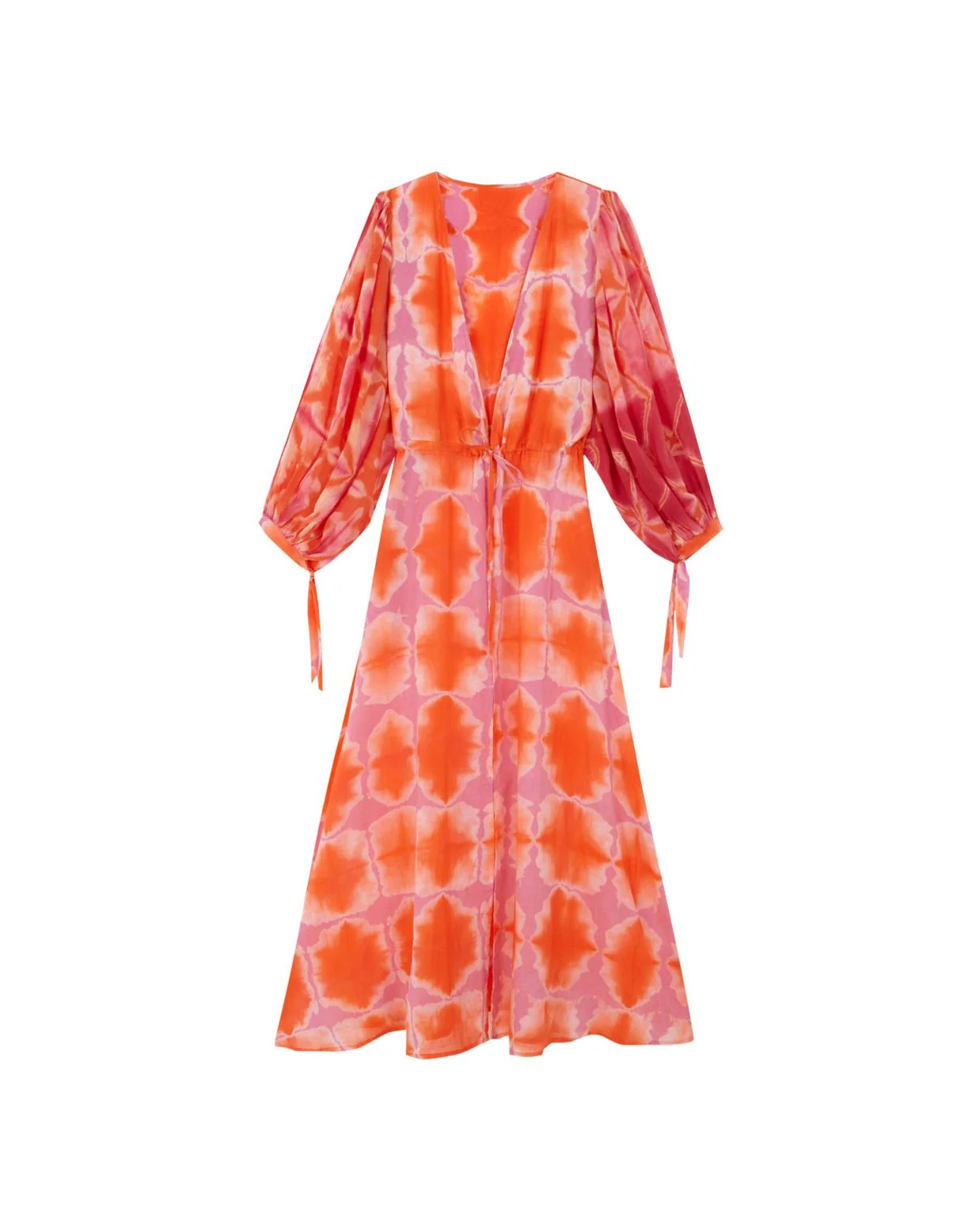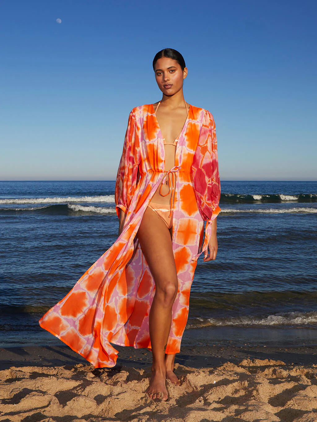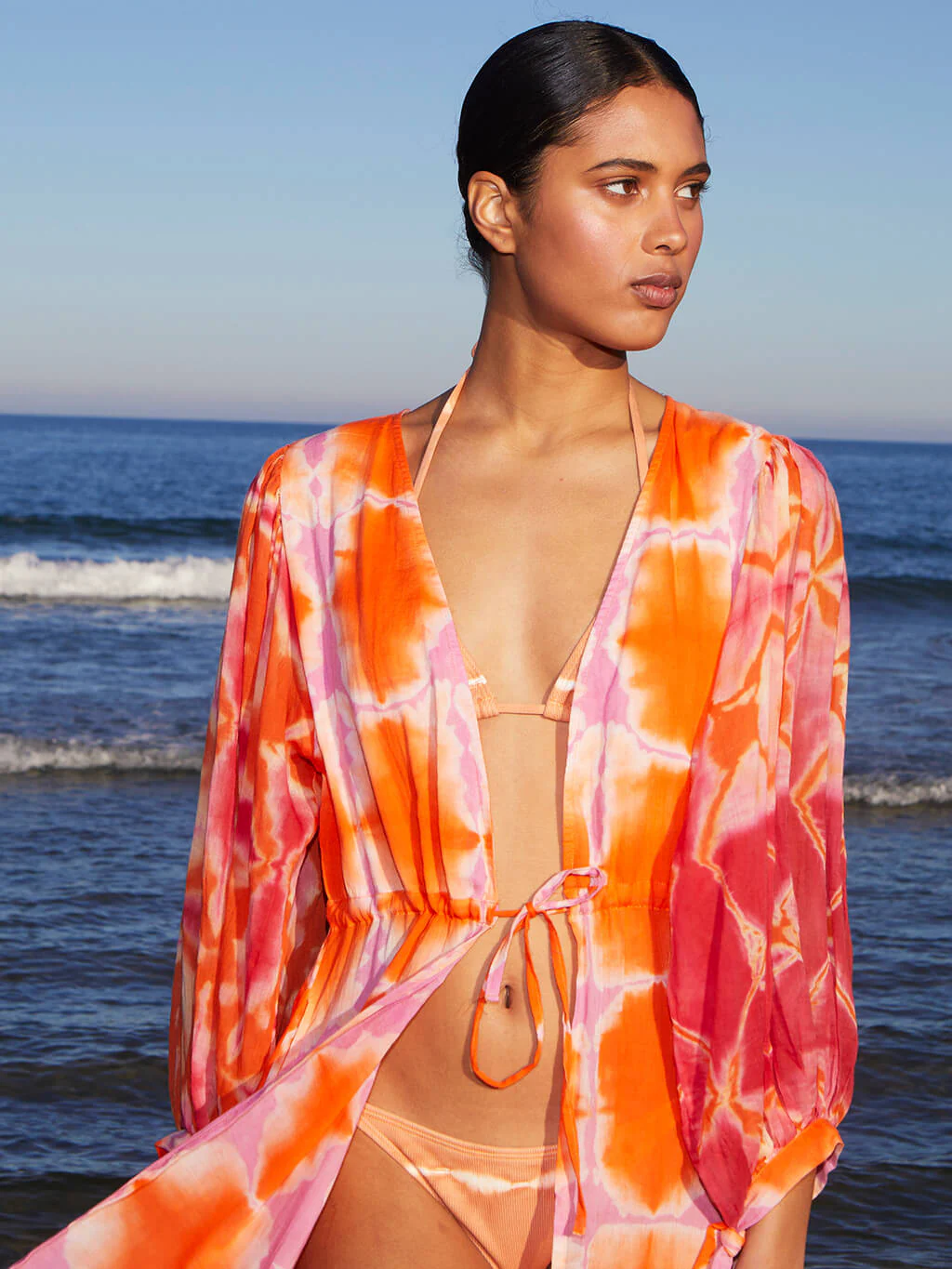 Kimono de algodón con estampado tie-dye en naranja y lila.