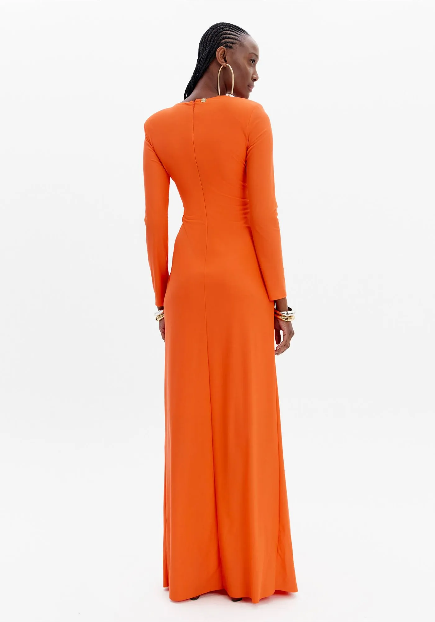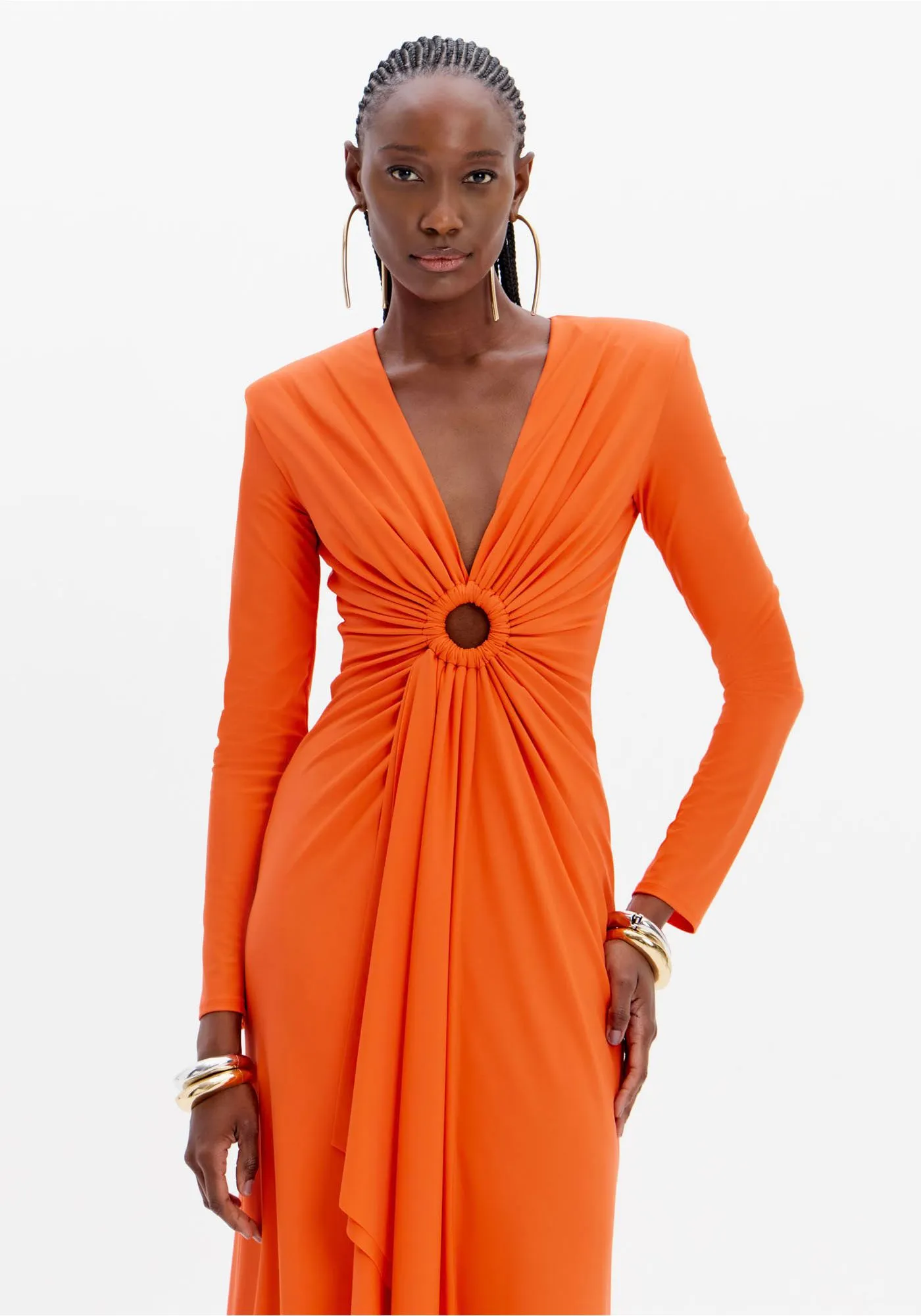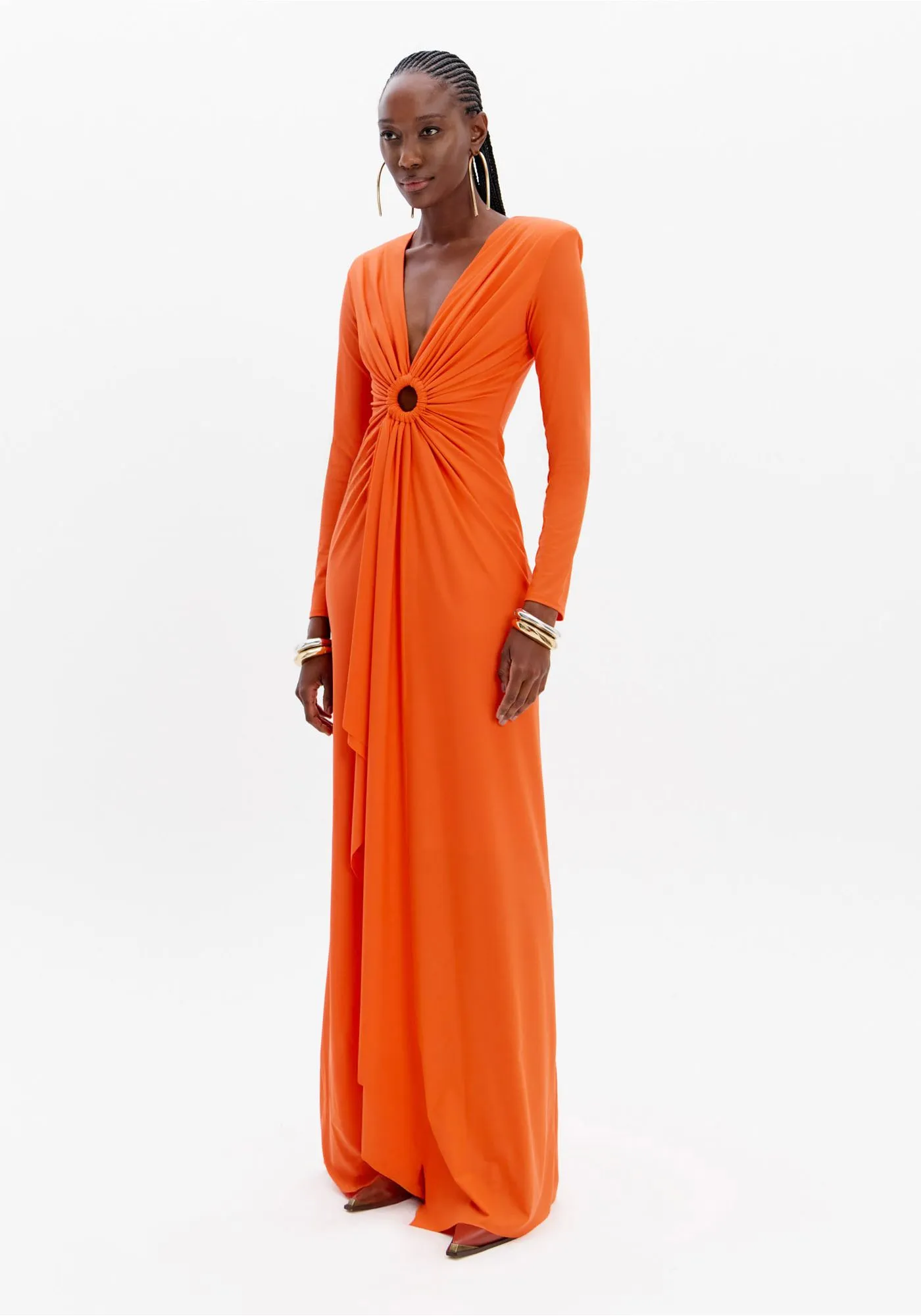 Este vestido largo drapeado presenta mangas largas, escote en V y cierre de cremallera en la espalda. El detalle de aro delantero es el toque final de elegancia que marca la diferencia. Llévalo en días especiales o eventos al aire libre.