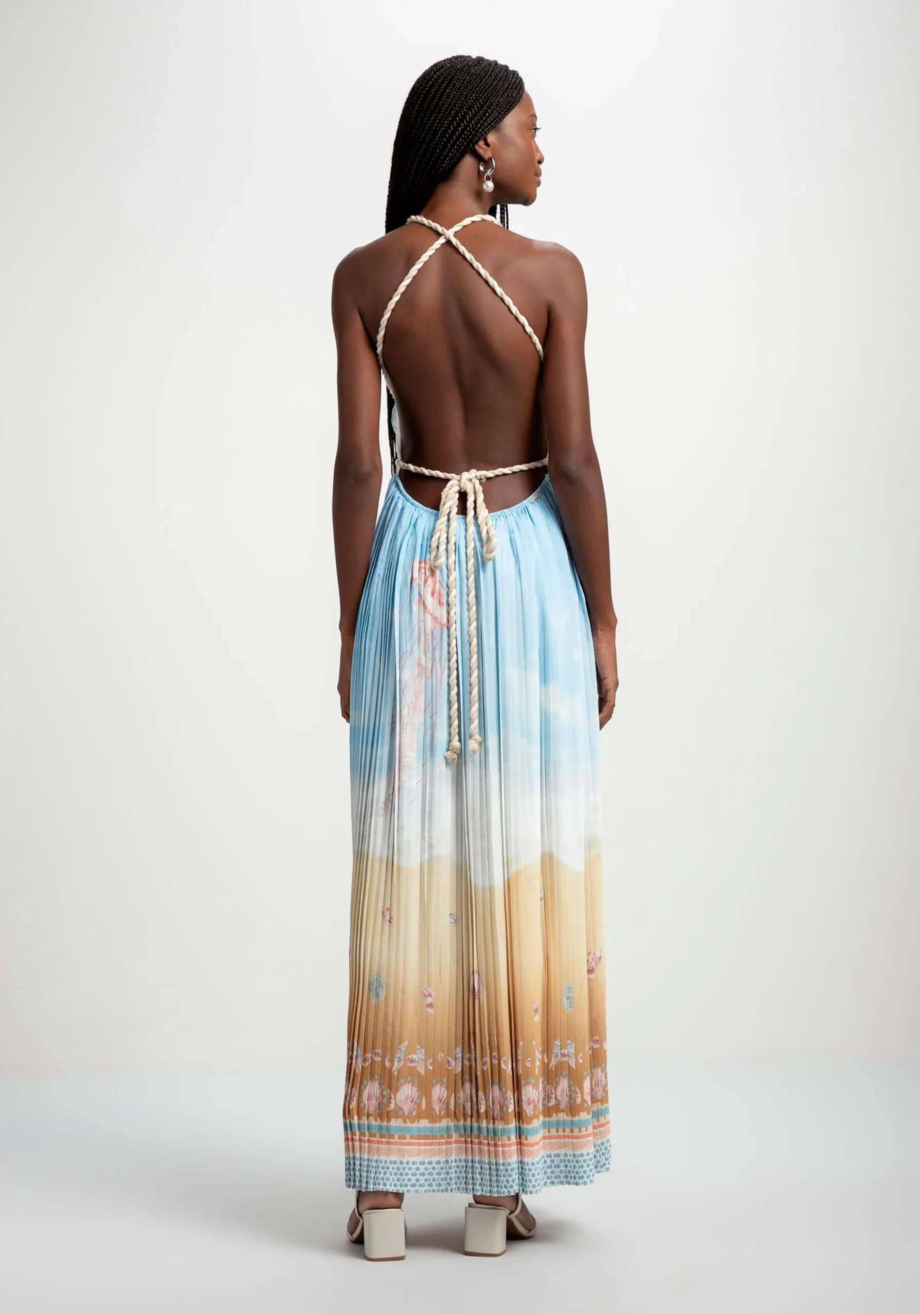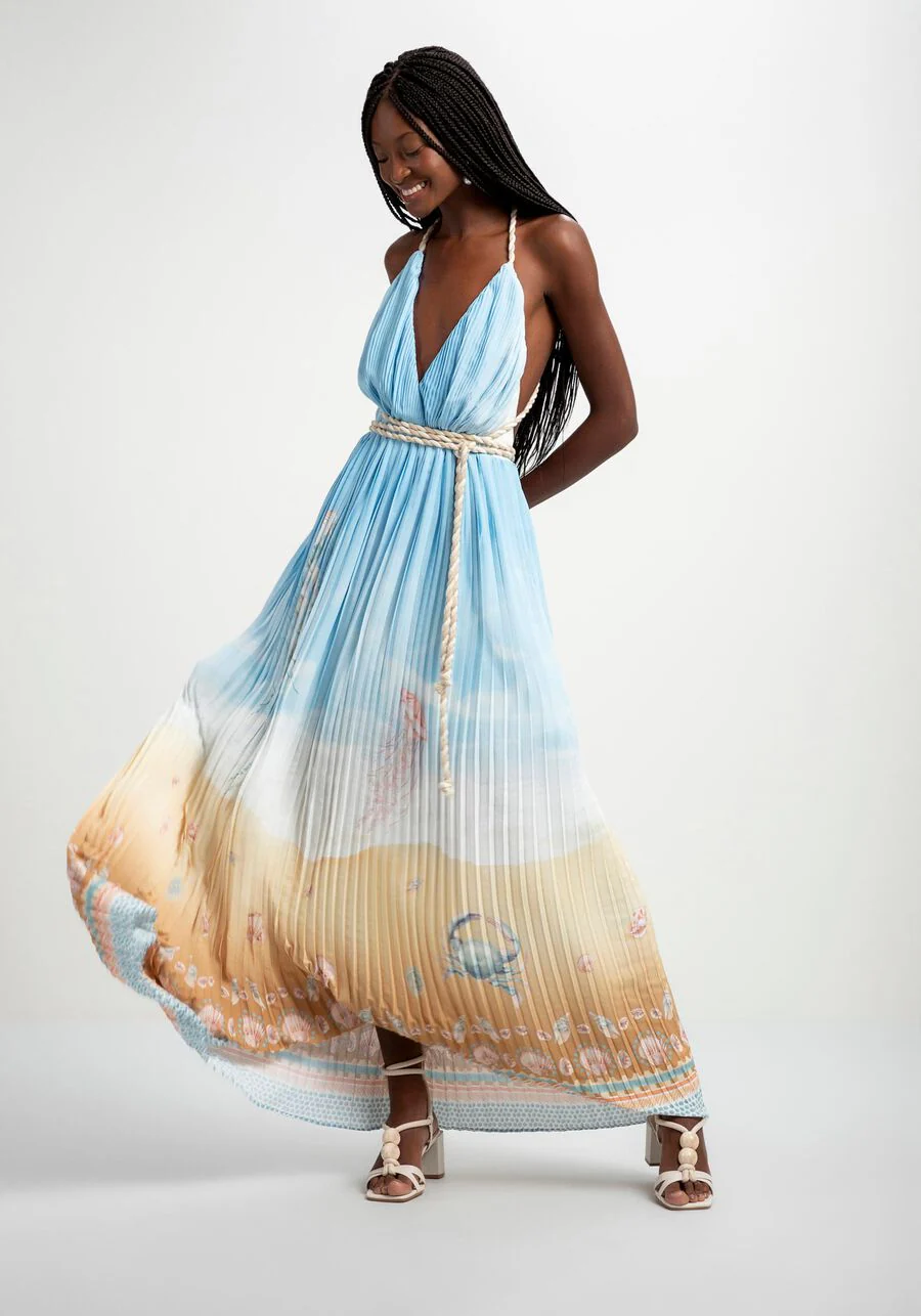 Vestido largo de corte fluido y mucho movimiento con efecto plisado, además del lazo que se puede hacer de varias maneras en la cintura. La suavidad del azul claro, en armonía con elementos del fondo marino, conforman la sofisticación del estampado “Millor”.