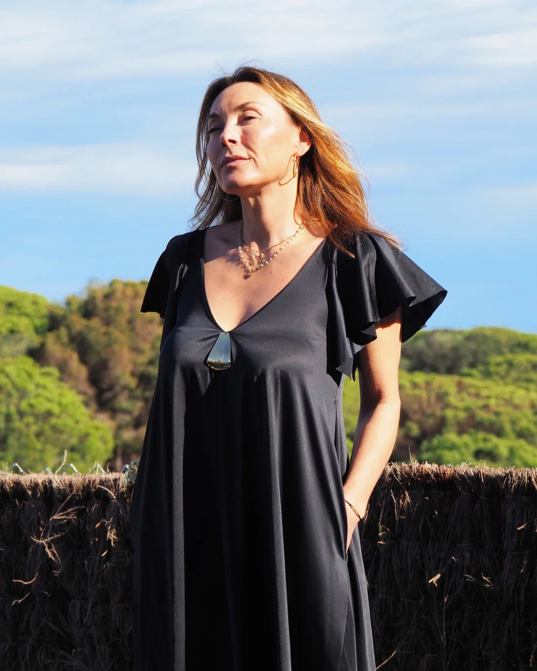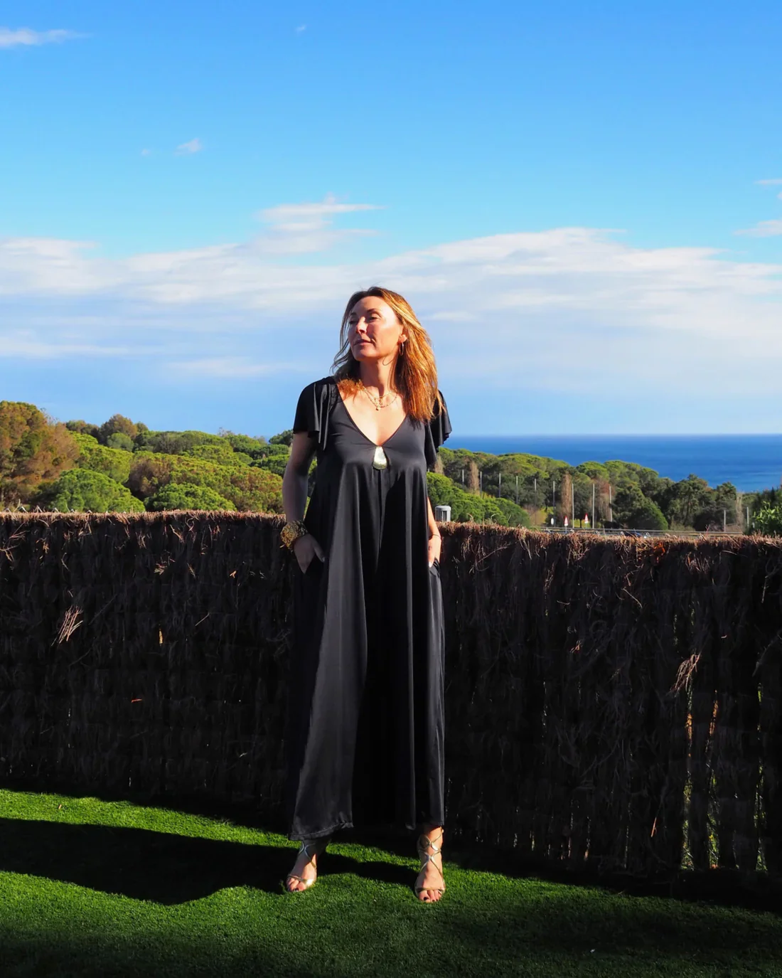 Las mangas mariposa añaden un movimiento etéreo y femenino, mientras que los bolsillos laterales brindan un equilibrio perfecto entre estilo y funcionalidad. Diseñado para mujeres que buscan versatilidad y distinción, este vestido se adapta a cualquier ocasión, desde una cena especial hasta un evento al aire libre.