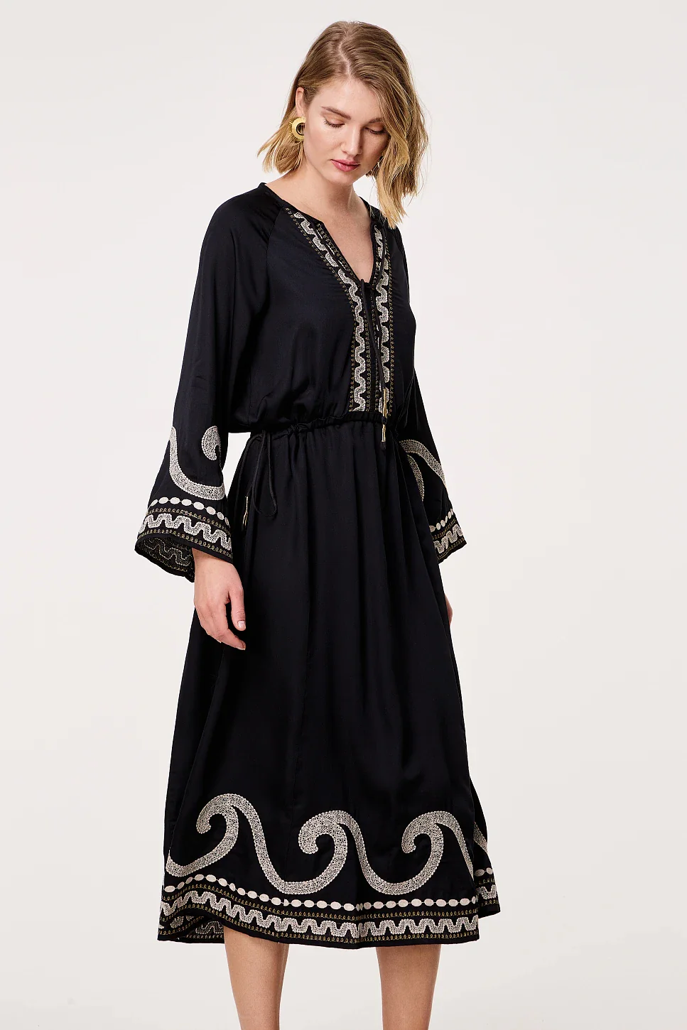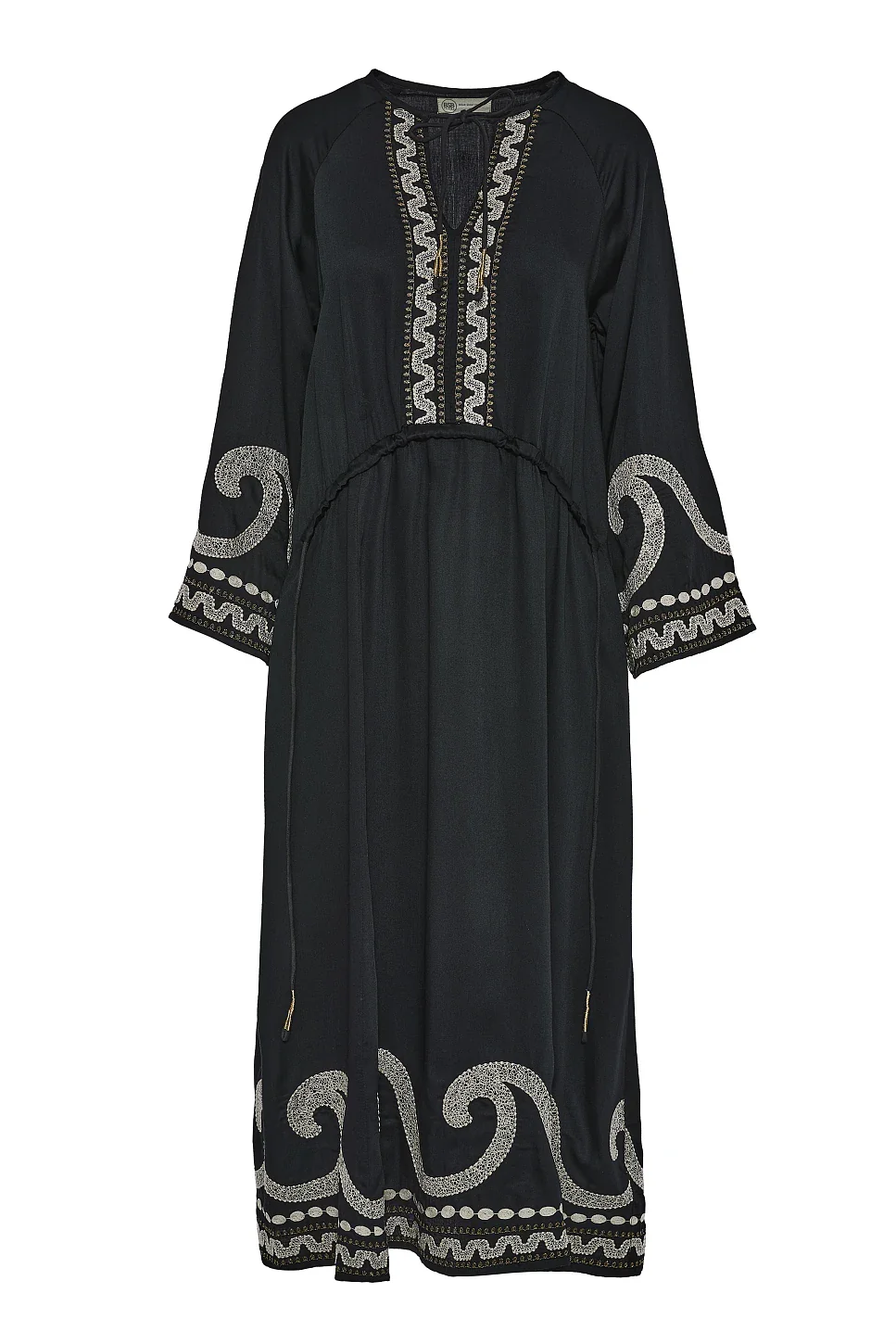 Vestido maxi bordado, manga larga, escote pico, cierre con lazo en el escote, con correas ajustables con lazo en la cintura, suave al tacto, diseño recto