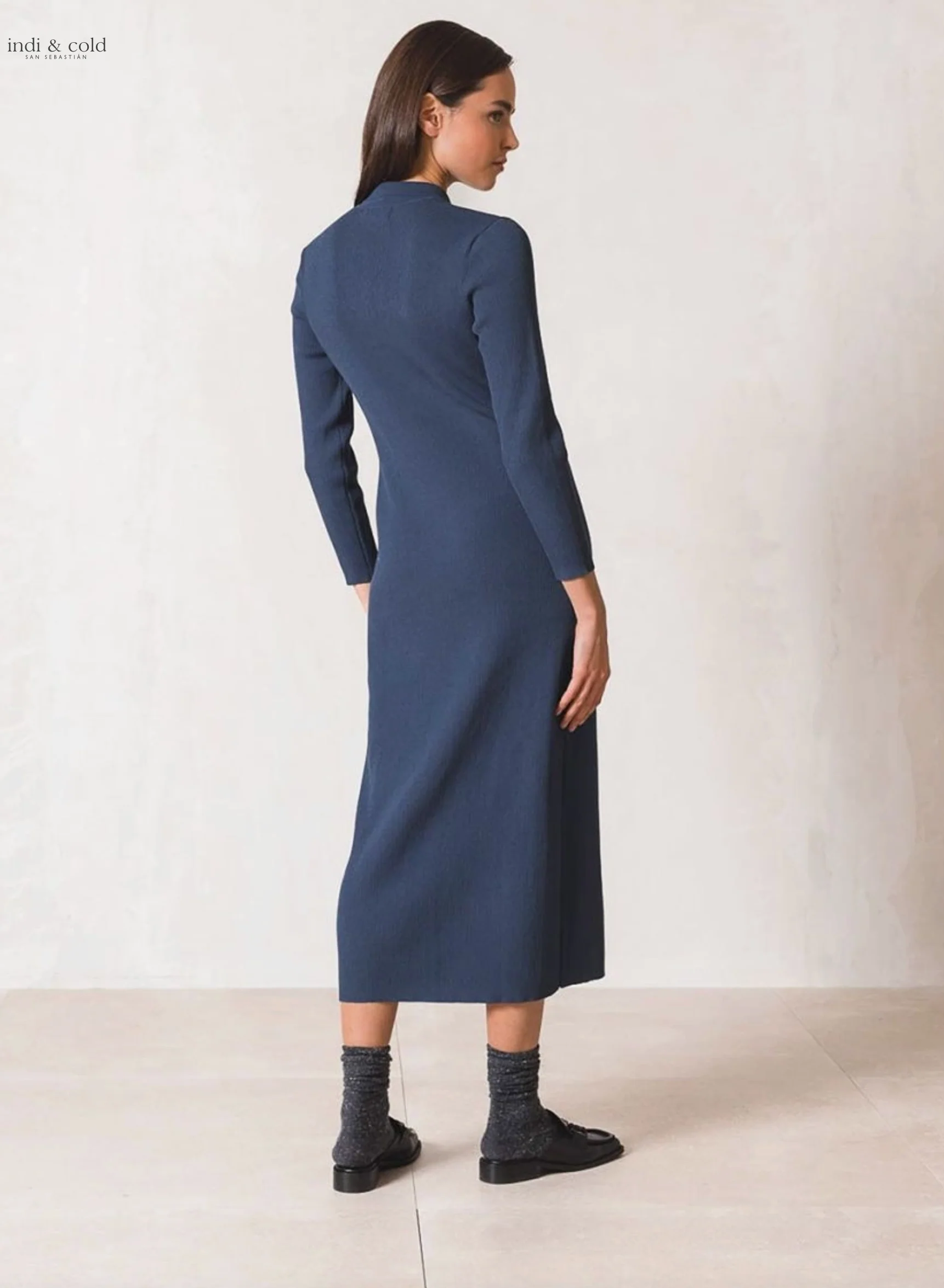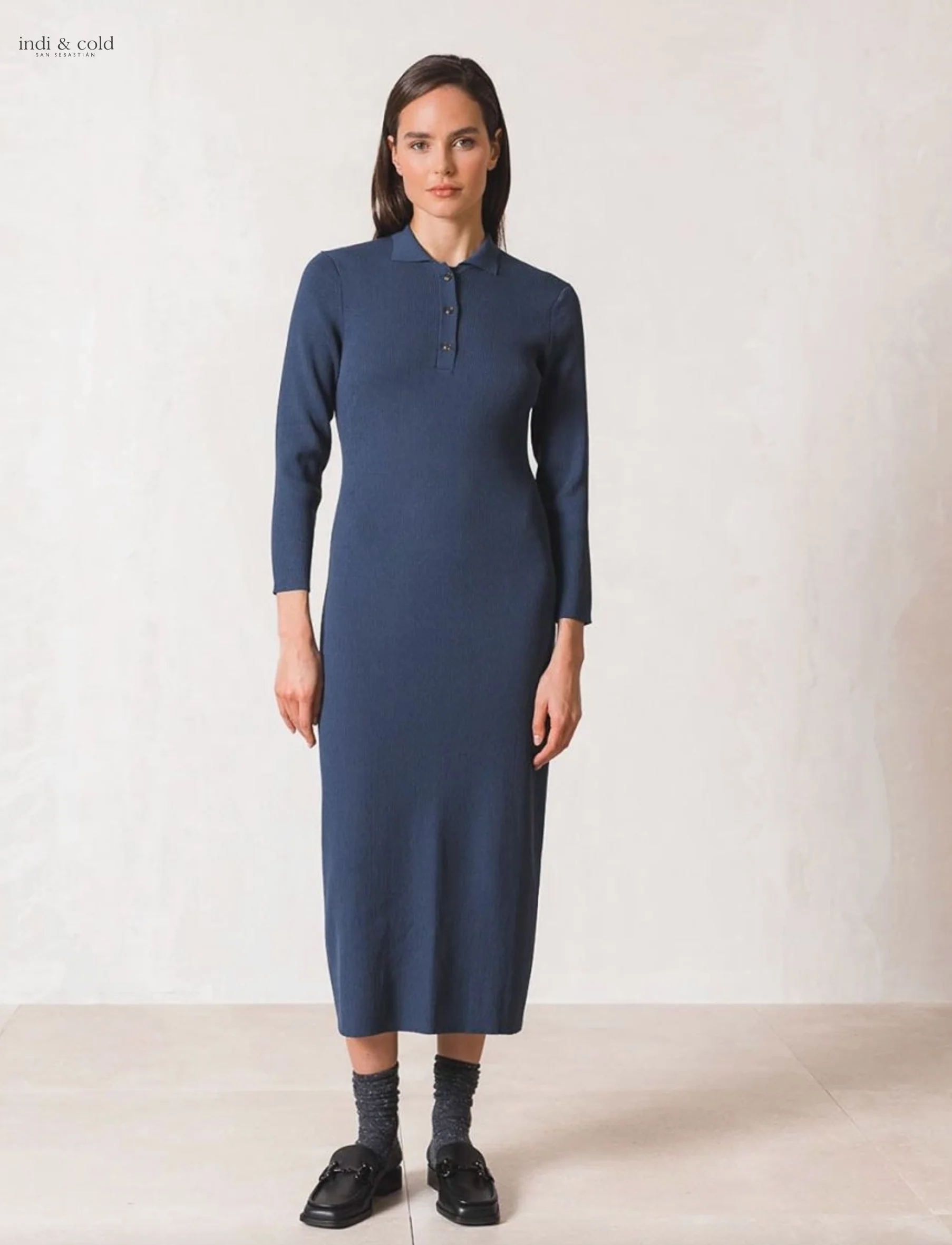 VESTIDO CAMISERO MAXI EN PUNTO CANALÉ – Cuello polo con cierre de botonadura – Hombro encajado y manga larga – Largo maxi – Fit ligeramente ajustado