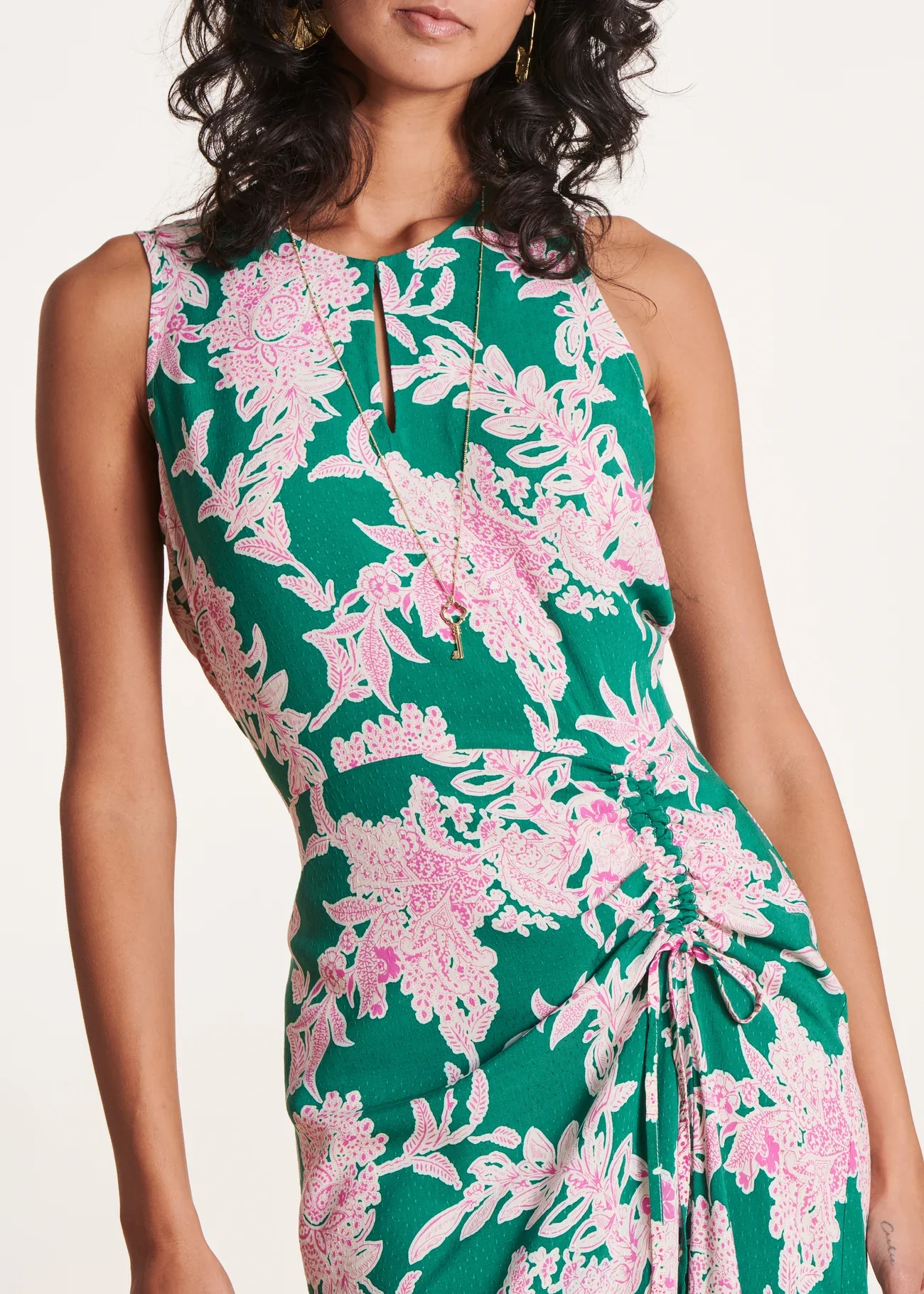 - Recorte lateral en la parte inferior del vestido con cordón y lazos