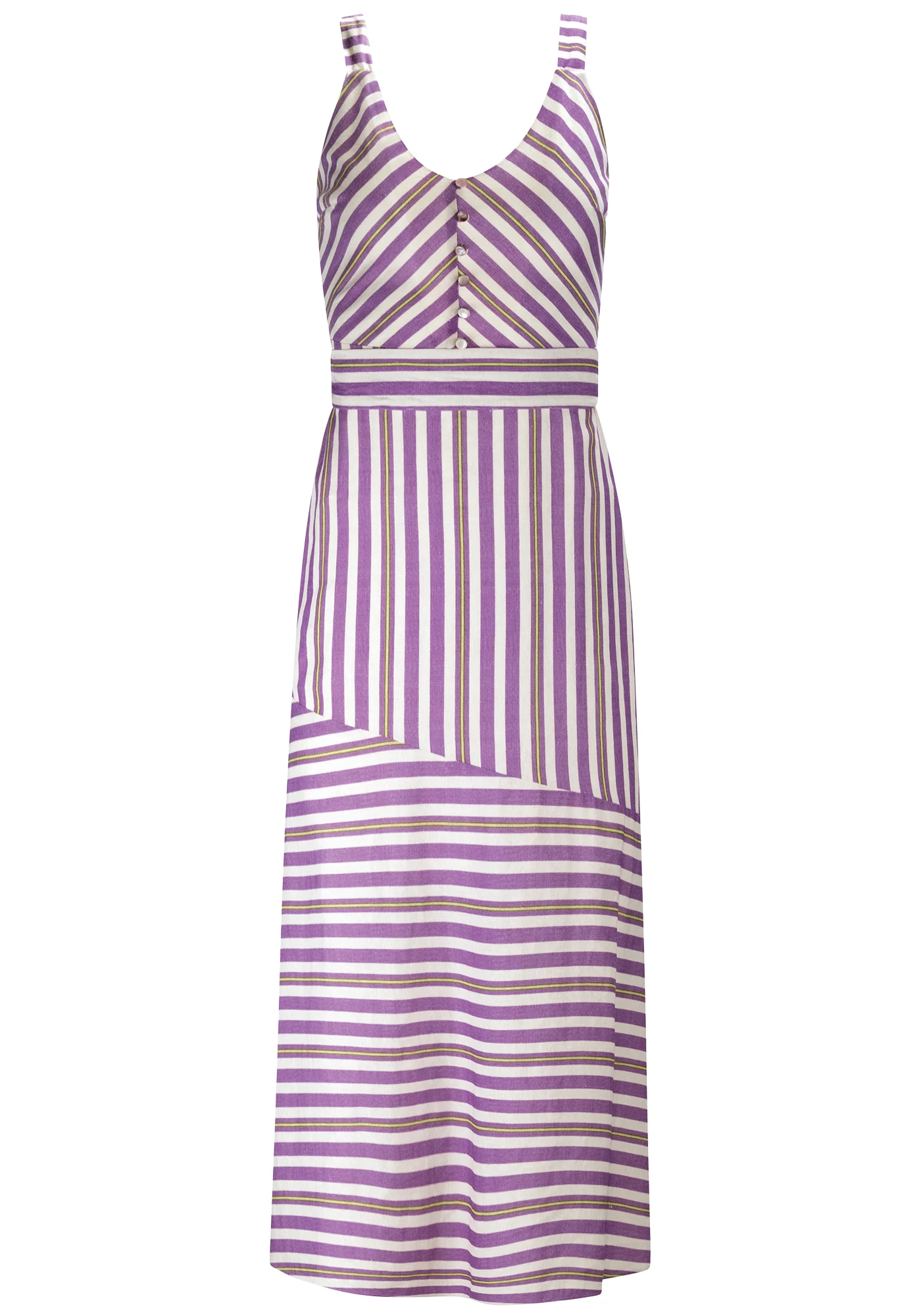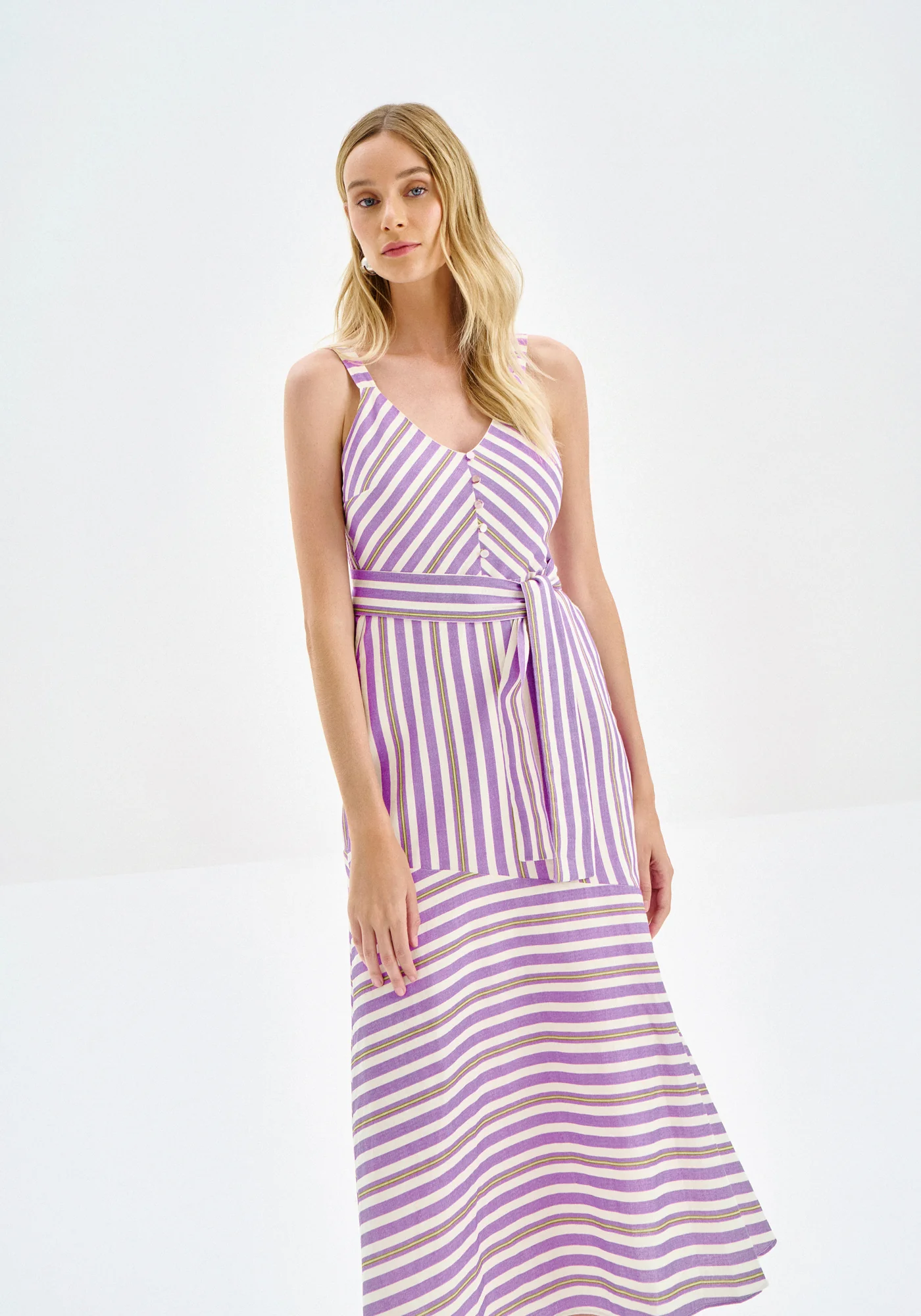 Pieza de la Colección Iris con largo midi alargado, escote en pico con botones decorativos, tirantes de ancho medio, corte diagonal en el bajo con abertura lateral, elástico en la espalda y cinturón tipo fajín.