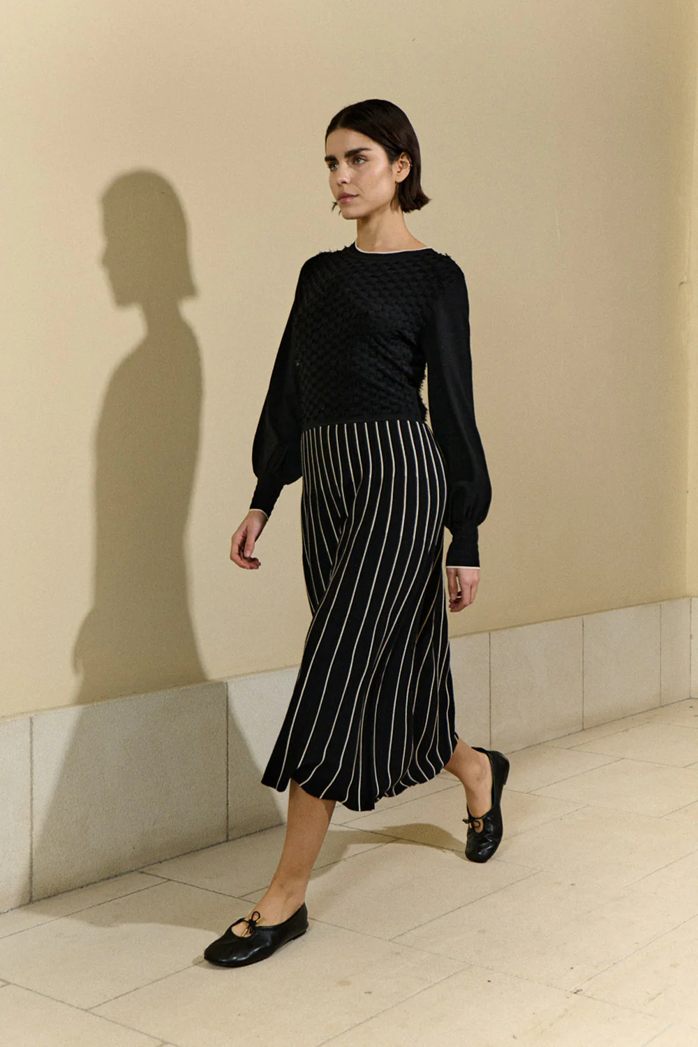 Vestido midi con falda radial y listado en vertical. Cuerpo entallado con escote redondo y mangas ligeramente abullonadas. Tejido en galga 14.