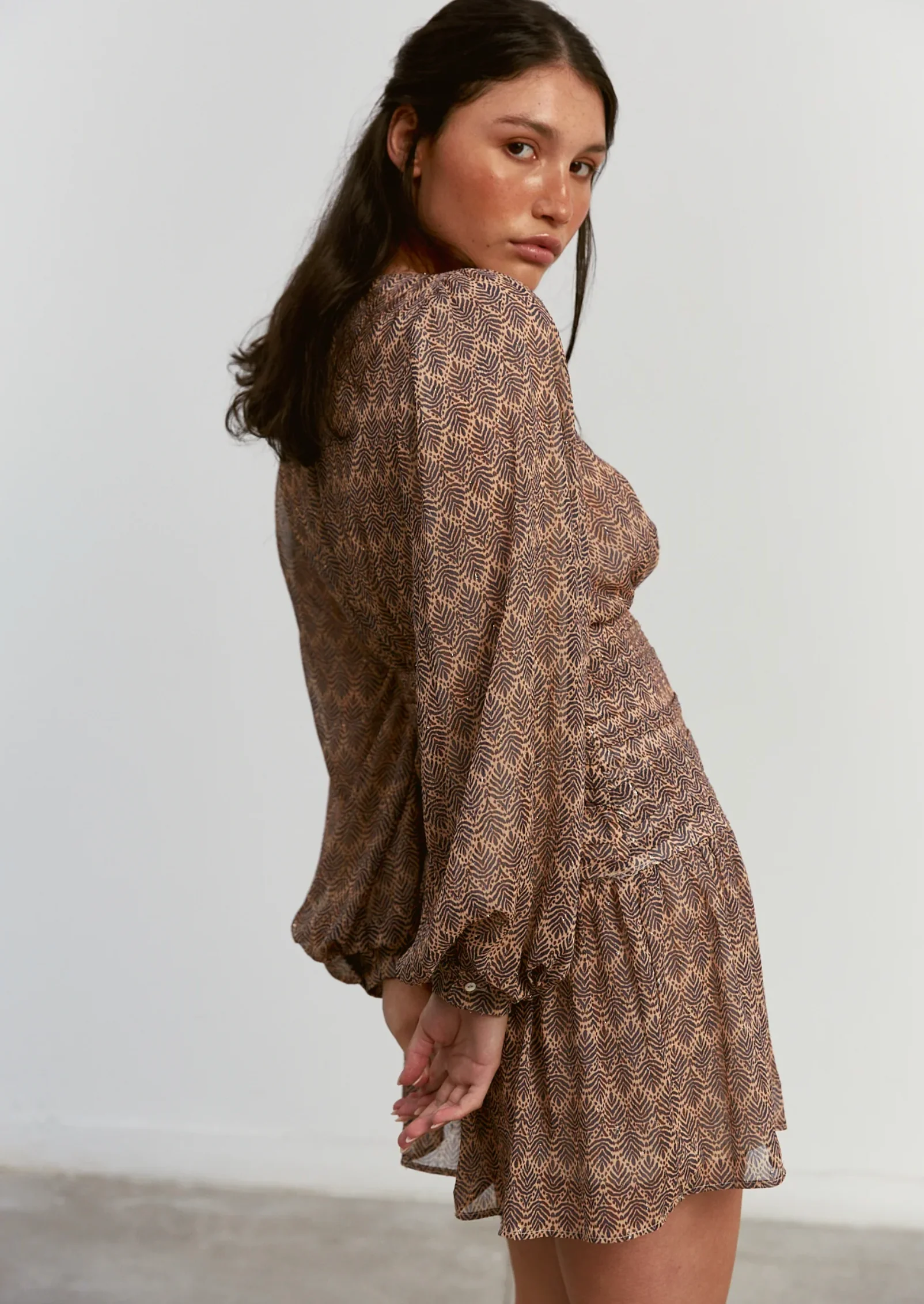 Vestido estampado corto con cuello redondo y manga abullonada, con detalle de cinturilla fruncida