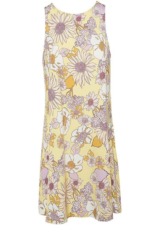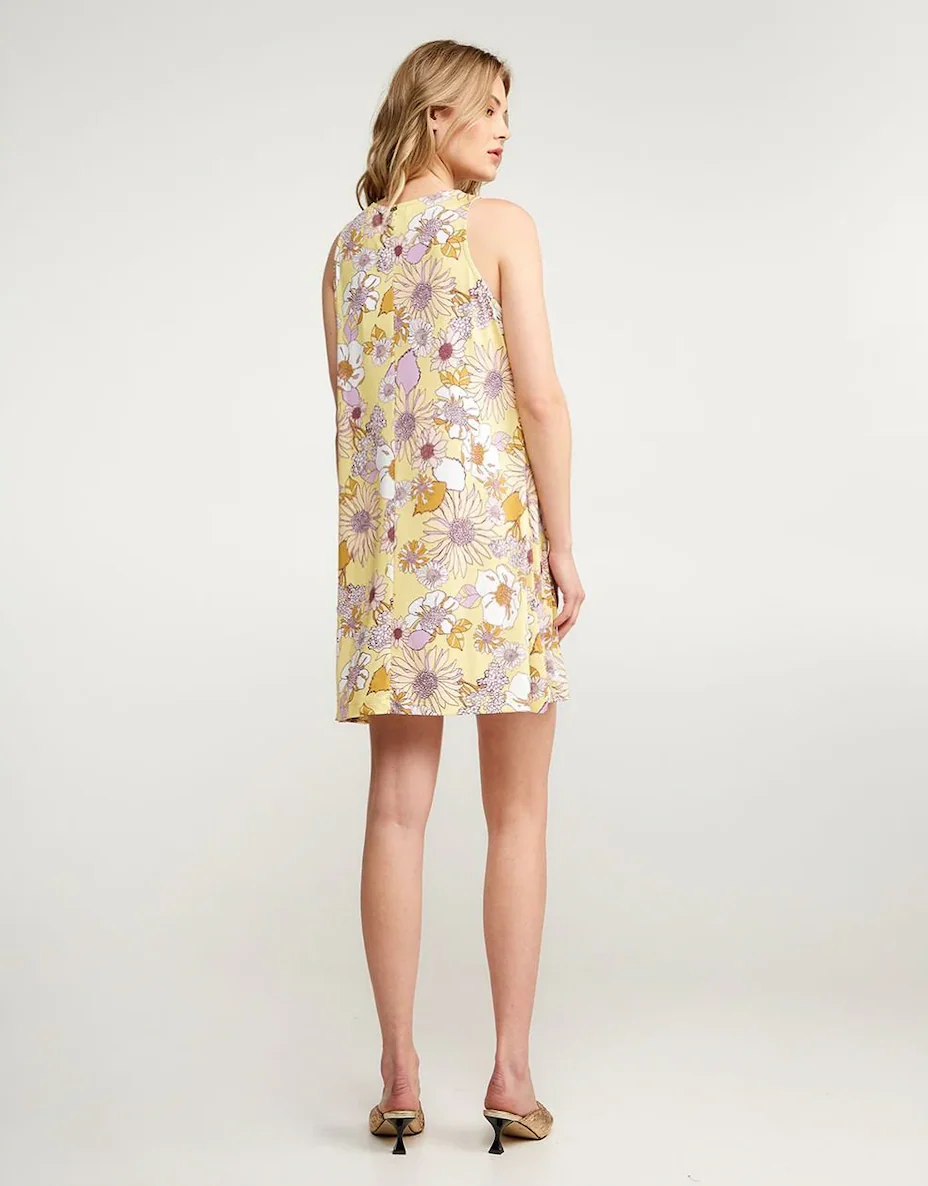 Vestido mini floral sin mangas con tejido elástico, tacto suave, escote redondo, ajuste relajado