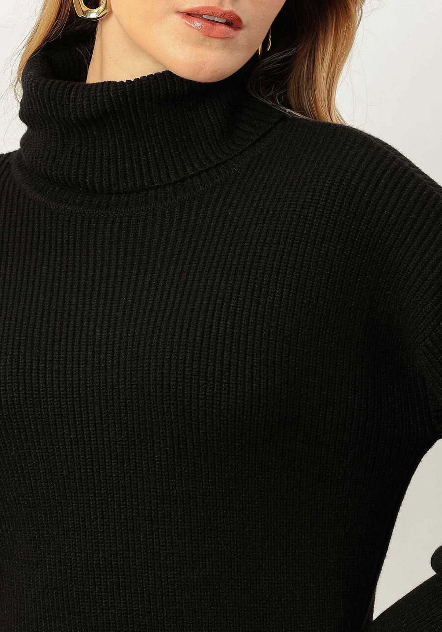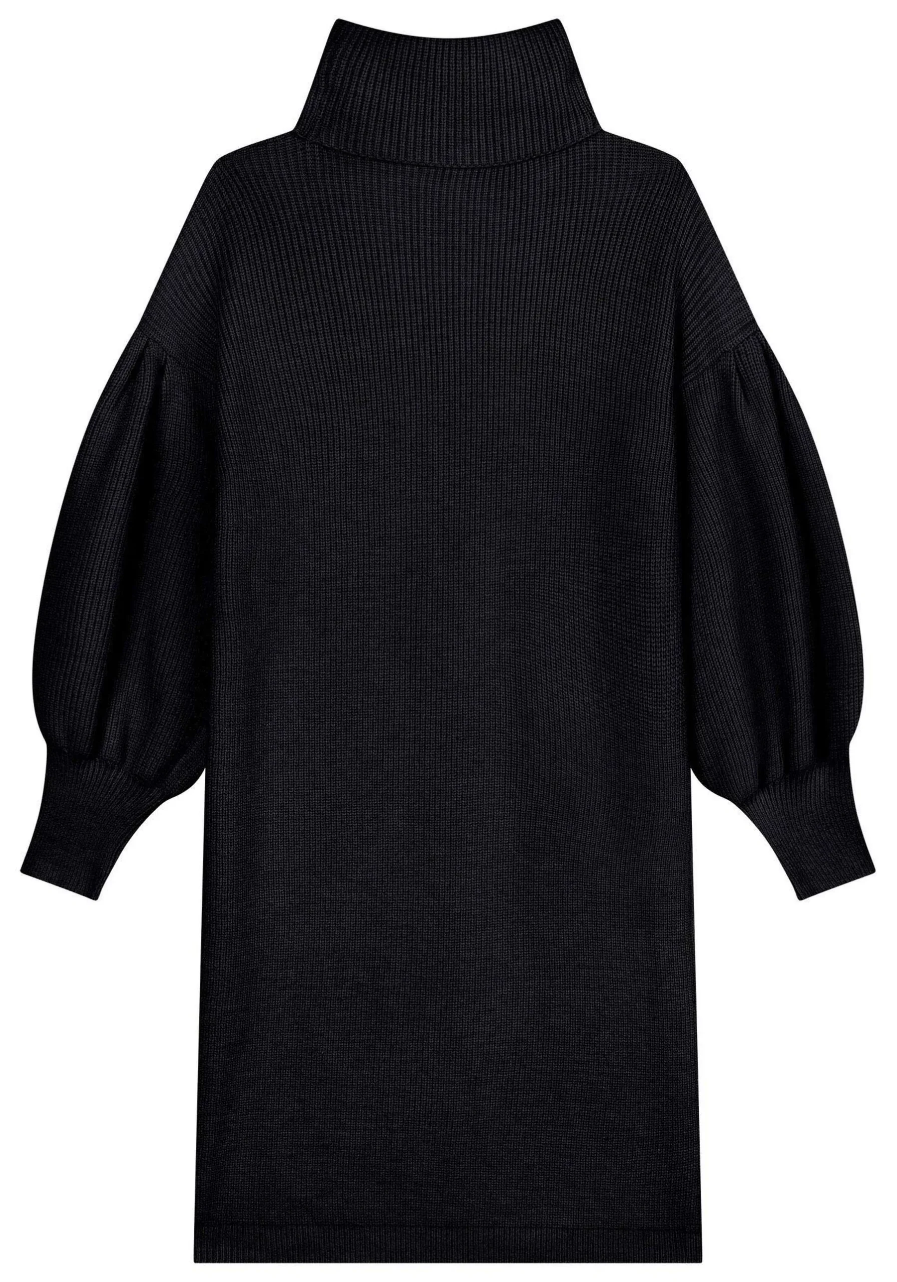 Confeccionado en punto más grueso, con trama cerrada. Pieza de la Colección de largo corto, modelado recto, cuello alto con vuelta y manga larga con sisas descentradas, puños y pliegues formando un maxi efecto abullonado.