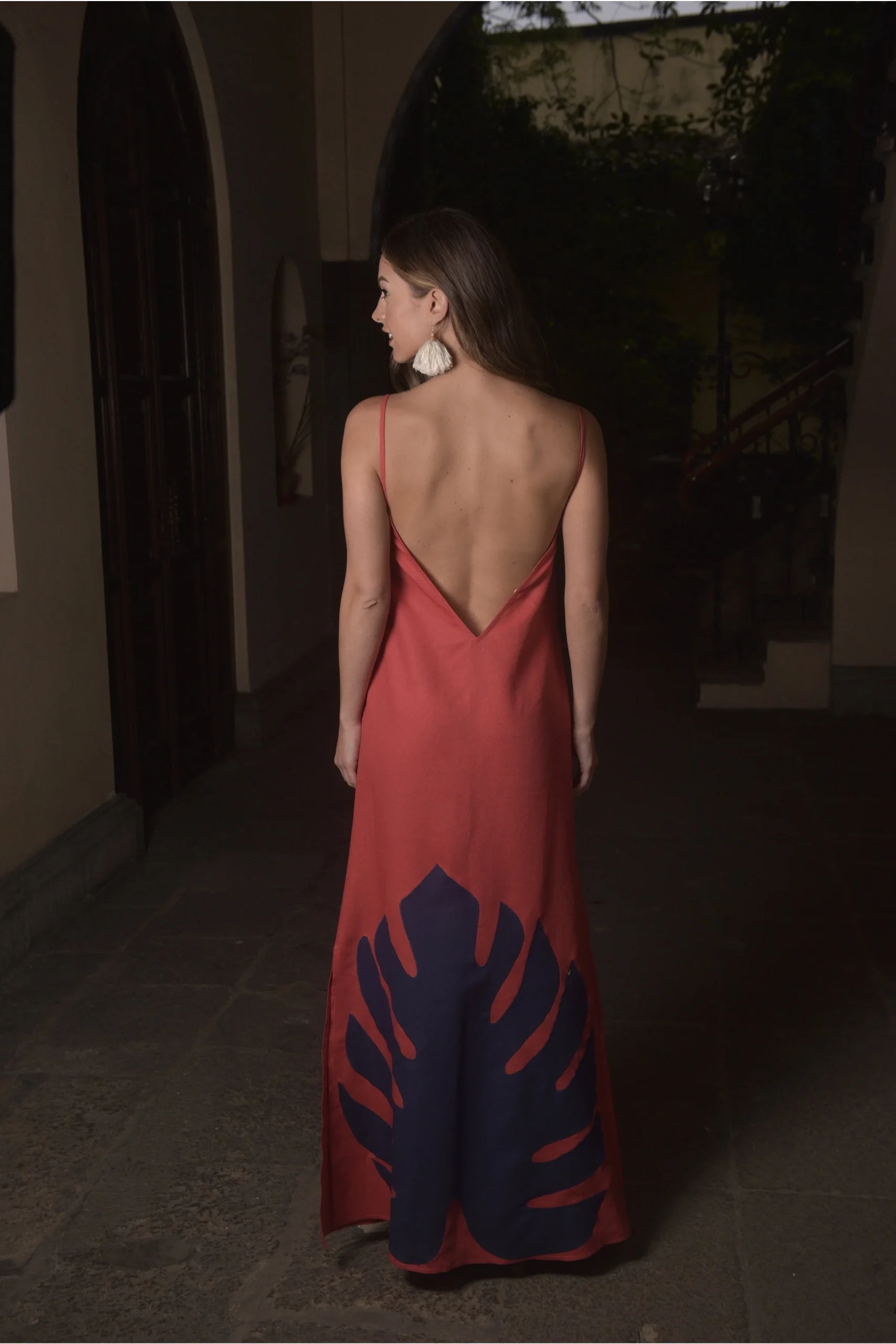 Vestido de lino y algodón color rojo (red claret), de tirantes con escote en la espalda y aplicación de hoja de lino bordada. «Soy artesana, entretejo ilusiones y bordo sueños, tristeza y esperanza» es parte de un poema al hermoso Oaxaca de Leonora Guilgue, y nosotros también somos artesanas y tejemos ilusiones, bordamos sueños y esperanzas.