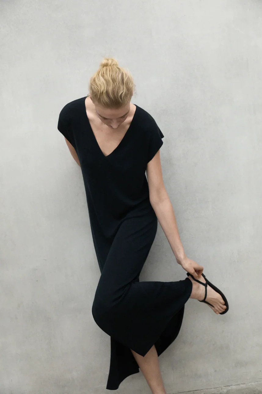 El vestido Onyx, elaborado con un material 70% TENCEL™ Lyocell. Estas fibras provienen de pulpa de madera de bosques certificados, y se producen mediante procesos de circuito cerrado que cumplen con los estándares ambientales más exigentes. Tiene un fit holgado y un elegante cuello en V. Es una opción perfecta para lucir con estilo y comodidad en cualquier ocasión.